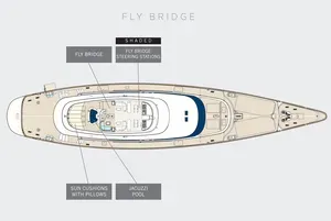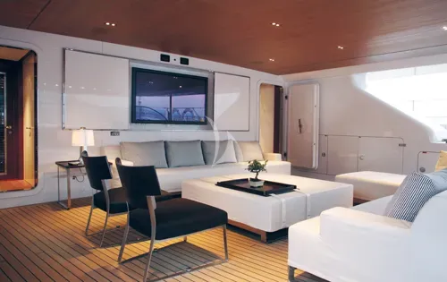 Large deck space includes a side swimming platform, two separate seating areas and a custom cockpit layout with a Jacuzzi and dining for 12 guests. On the main deck, a fully-shaded aft deck dining and lounge area with a 60 inch television leads into the spacious main saloon. Interiors are sophisticated and modern with white linen, pale oak and Hermes leather.