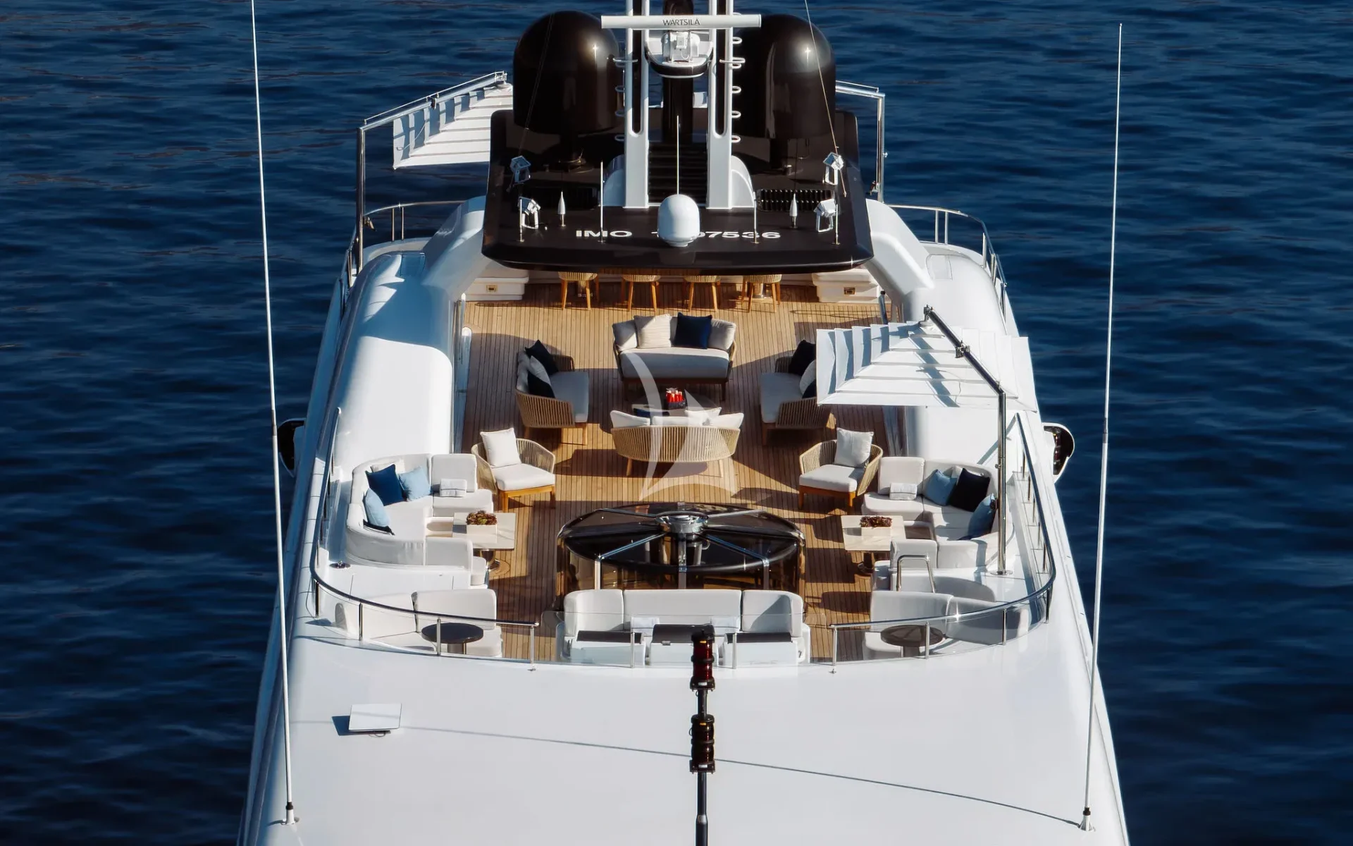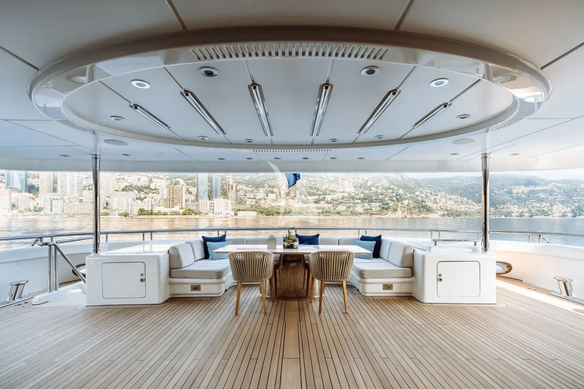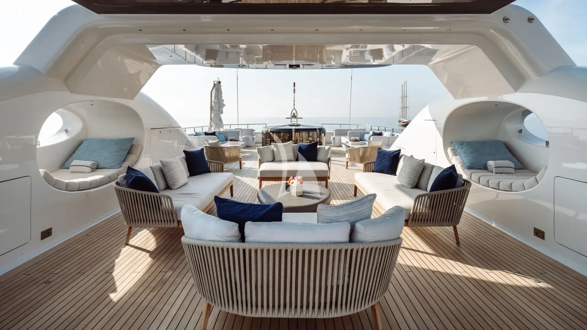 SAMIRA’s exterior deck spaces are equally impressive, inviting guests to bask in the sun, seek shade, or indulge in alfresco dining against the backdrop of the open ocean. Whether lounging on the expansive sundeck or enjoying leisurely moments with loved ones, every corner of SAMIRA beckons to be explored and savored. The retractable transom further enhances the outdoor experience, providing additional space for sunbathing and direct access to the inviting waters below.