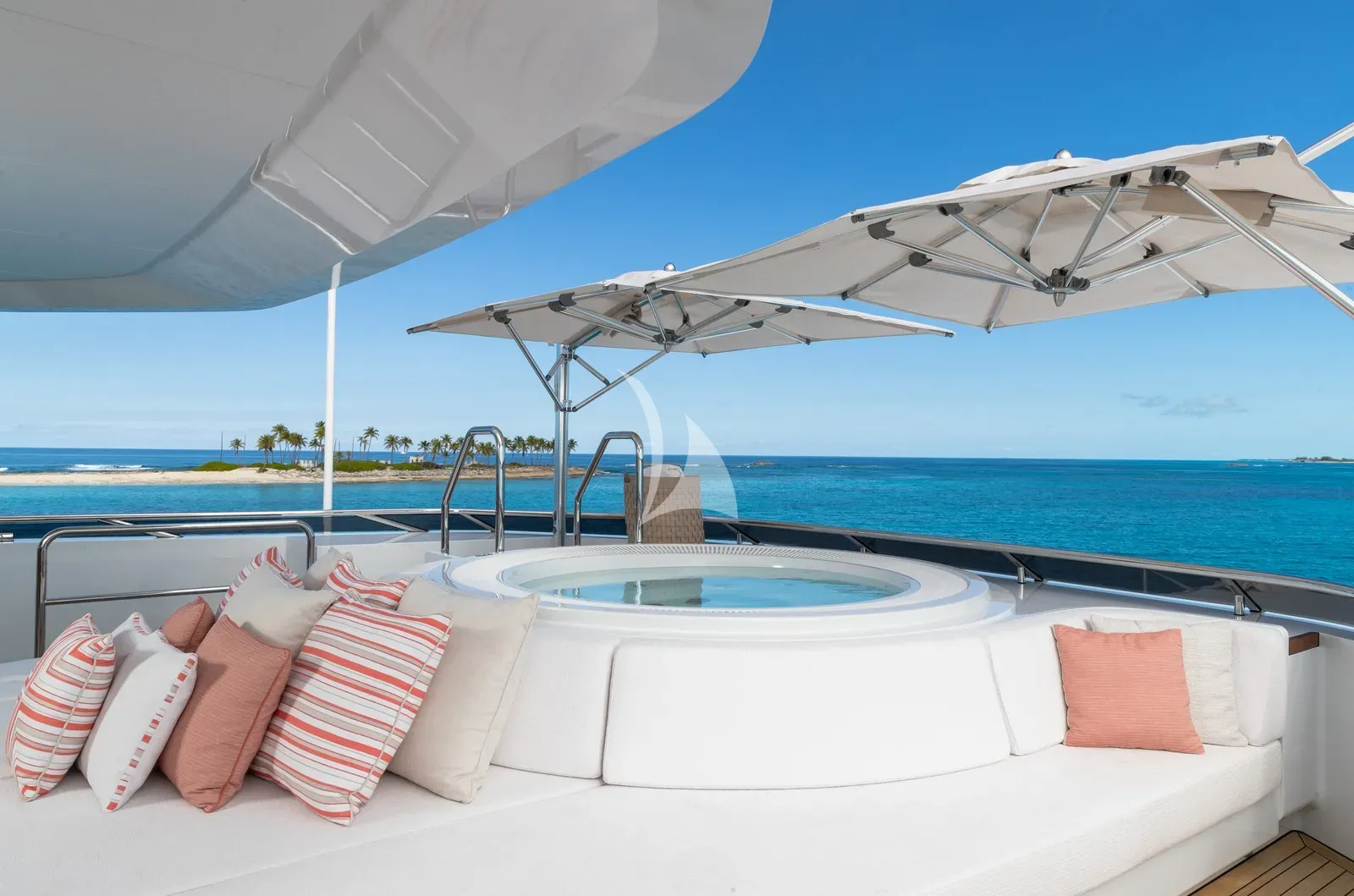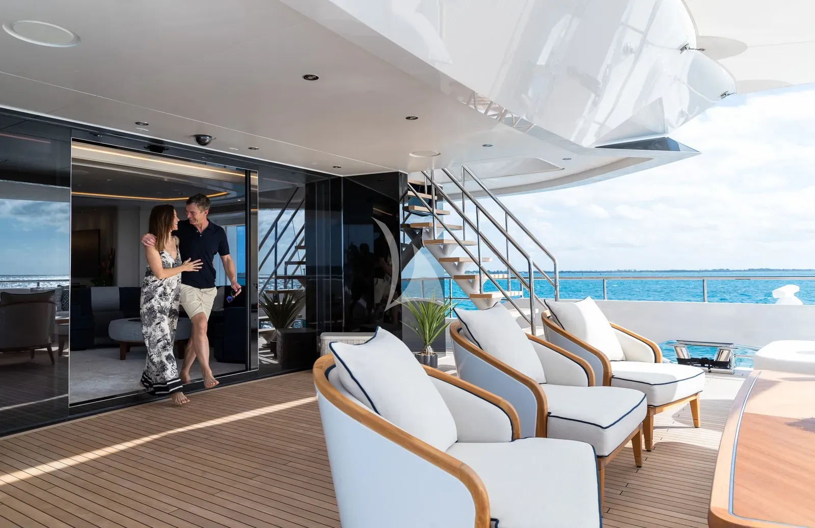 SANTOSHA offers the ultimate retreat with her accommodation for up to 12 guests across six luxurious cabins, sundeck jacuzzi, multiple dining areas, gym which converts in the massage area, and a large beach club.