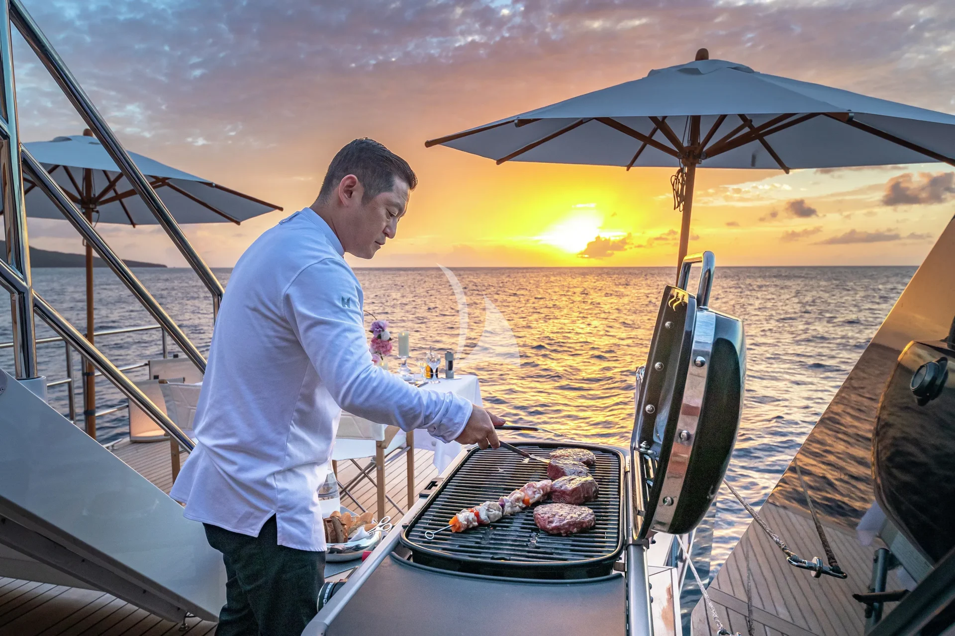 From formal dining to casual lounging, the spaces, both inside and out, suit any mood. From a colourful breakfast buffet at the inside/outside bar on the main deck to an intimate dinner on the swim platform, there’s variety and versatility at every turn. And, with the option of a gym or massage room on board, indulgent wellness is never far away.