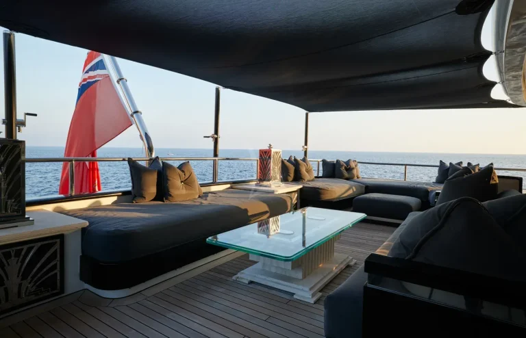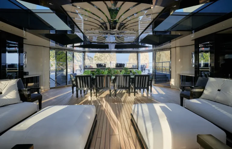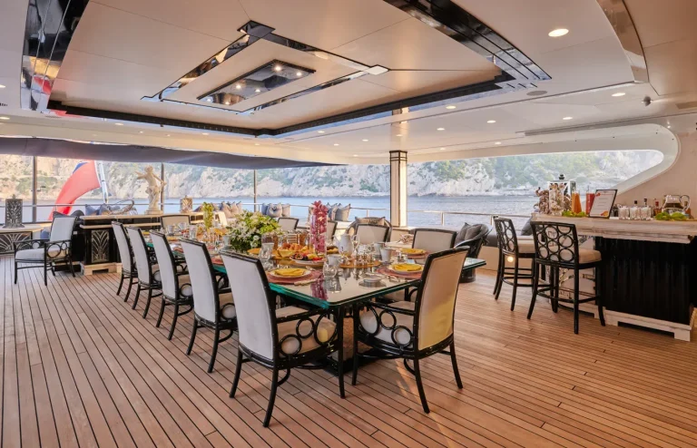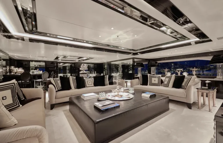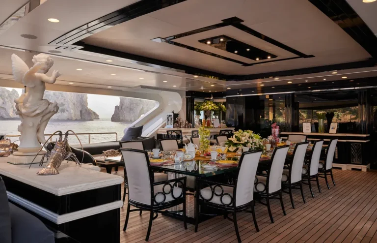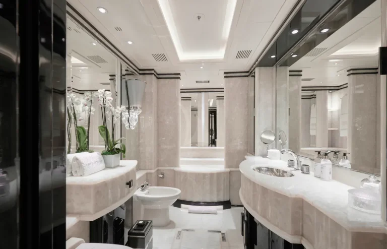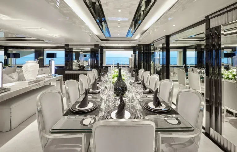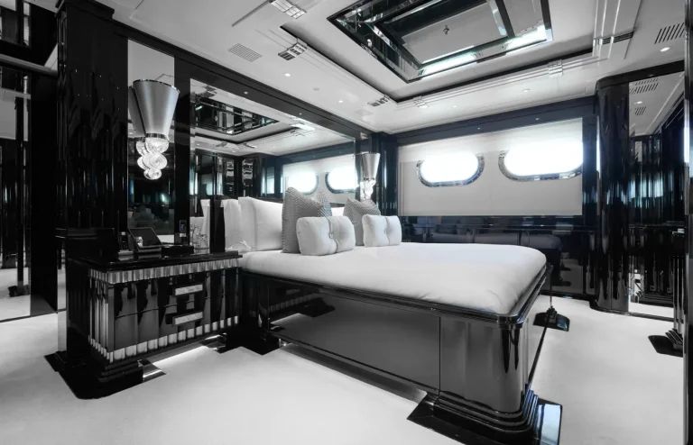 An Art Deco theme runs throughout the interiors and exteriors of SILVER ANGEL, with glossy black oak panelling complemented by Onyx and white furnishings and lots of mirrors, while white marble and silver leaf add some glamour and sparkle. She can accommodate 12 guests across 7 cabins, including a full-beam Owner’s suite on the main deck forward. The rest of the guest accommodation is spread across a further four doubles, including a VIP cabin on the upper deck, and two twin cabins on the lower deck.