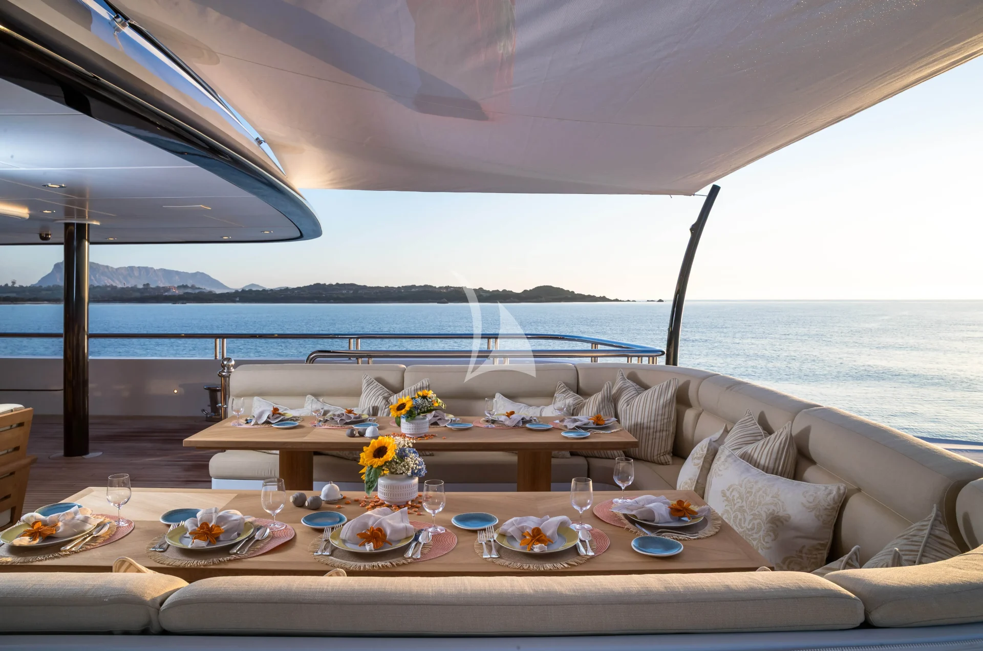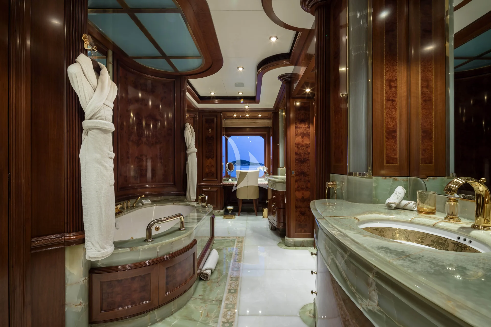 Accommodations are spread across seven cabins for up to 12 guests in as many as 16 sleeping locations which can also accommodate nannies or other staff. The full-beam owner’s suite is a sanctuary, complete with a forward-facing private observation lounge, perfect for a quiet coffee in the morning, a massage in the afternoon, and a cocktail in the evening. A treadmill and Peloton are situated here, providing guests the option of exercising in the peace and comfort of their own cabin. There is a private office, a spa-like marble bathroom with a Jacuzzi tub, separate showers and toilets, and his-and-hers walk-in closets. The VIP suite on the bridge deck boasts stunning views, a spacious sitting area, and an elegant ensuite. Four additional guest cabins on the lower deck offer king-size beds, plush seating, and opulent ensuites, with two featuring hidden Murphy beds for additional flexibility. A beautifully finished twin cabin provides an ideal space for children or staff.