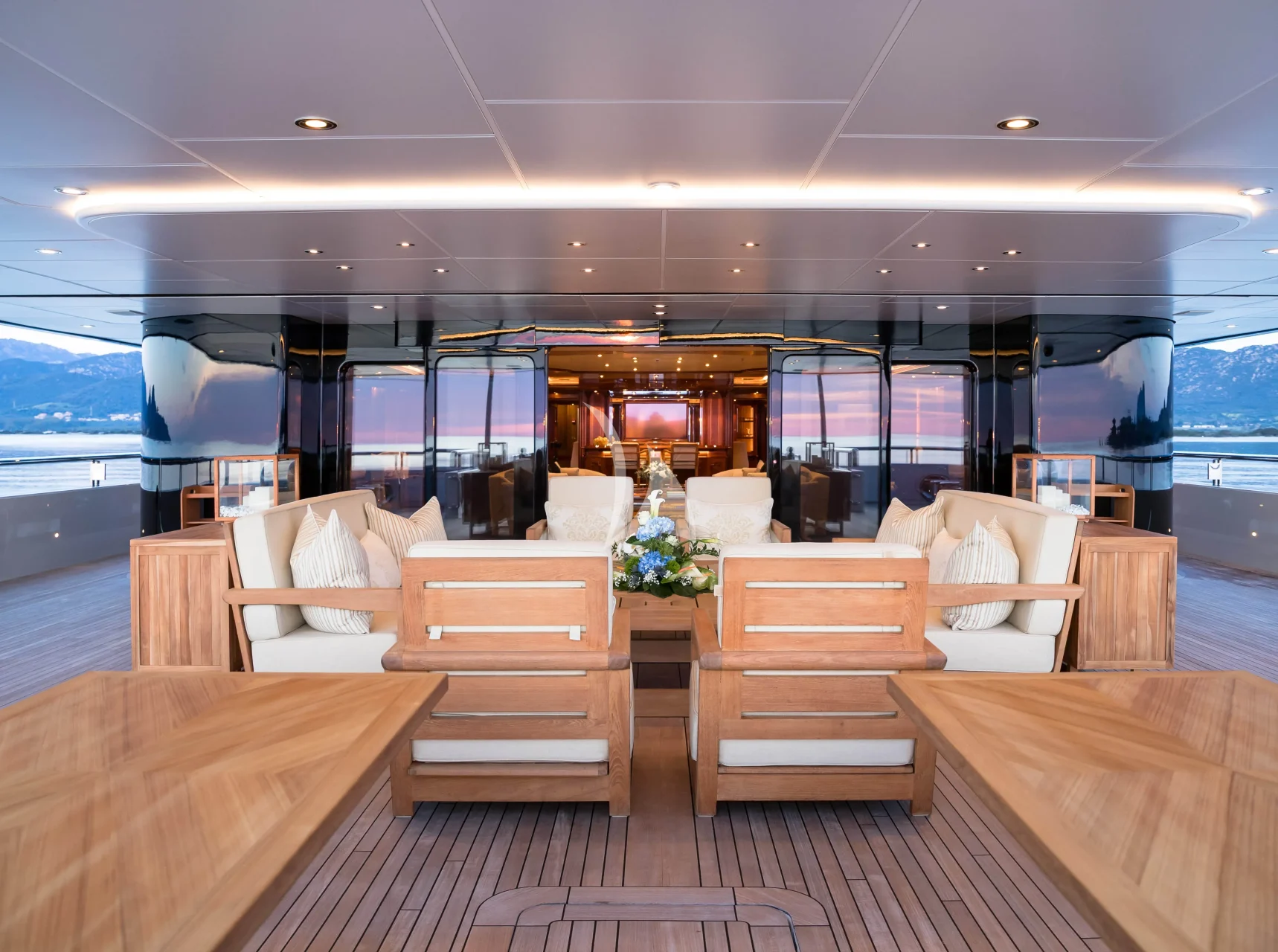 One of STARFIRE’s most unique features is her sheer sense of space. Her vast interior volume, spanning five levels, rivals yachts in the mid-80m range, with beautifully finished woodwork, elegant furnishings, and thoughtful design elements that create an inviting, timeless and completely relaxed aesthetic. Throughout STARFIRE, she benefits from unusually high ceilings which adds to the overall feel of spaciousness. The main salon, with its floor-to-ceiling windows, offers a luxurious yet cozy setting for socializing, featuring a beautifully carved Zuretti bar and inviting seating. The upper decks house multiple lounges, including a forward observation room, one of the best spots onboard for watching the world go by whether seated inside or out. A dedicated children’s area which can transform into a stylish lounge or disco, adds another layer of versatility. Other standout features include an English pub with darts and enclosed video arcade, indoor and under the stars outdoor cinemas, and a private gaming room. Bespoke teak and stainless furniture has been designed entirely for STARFIRE by renowned yacht furniture company Siebensee. Throughout STARFIRE there has been an emphasis on creating numerous small, quiet locations where guests can sneak away for work, calls, reading or just relaxing. In short, STARFIRE lets your imagination run wild.