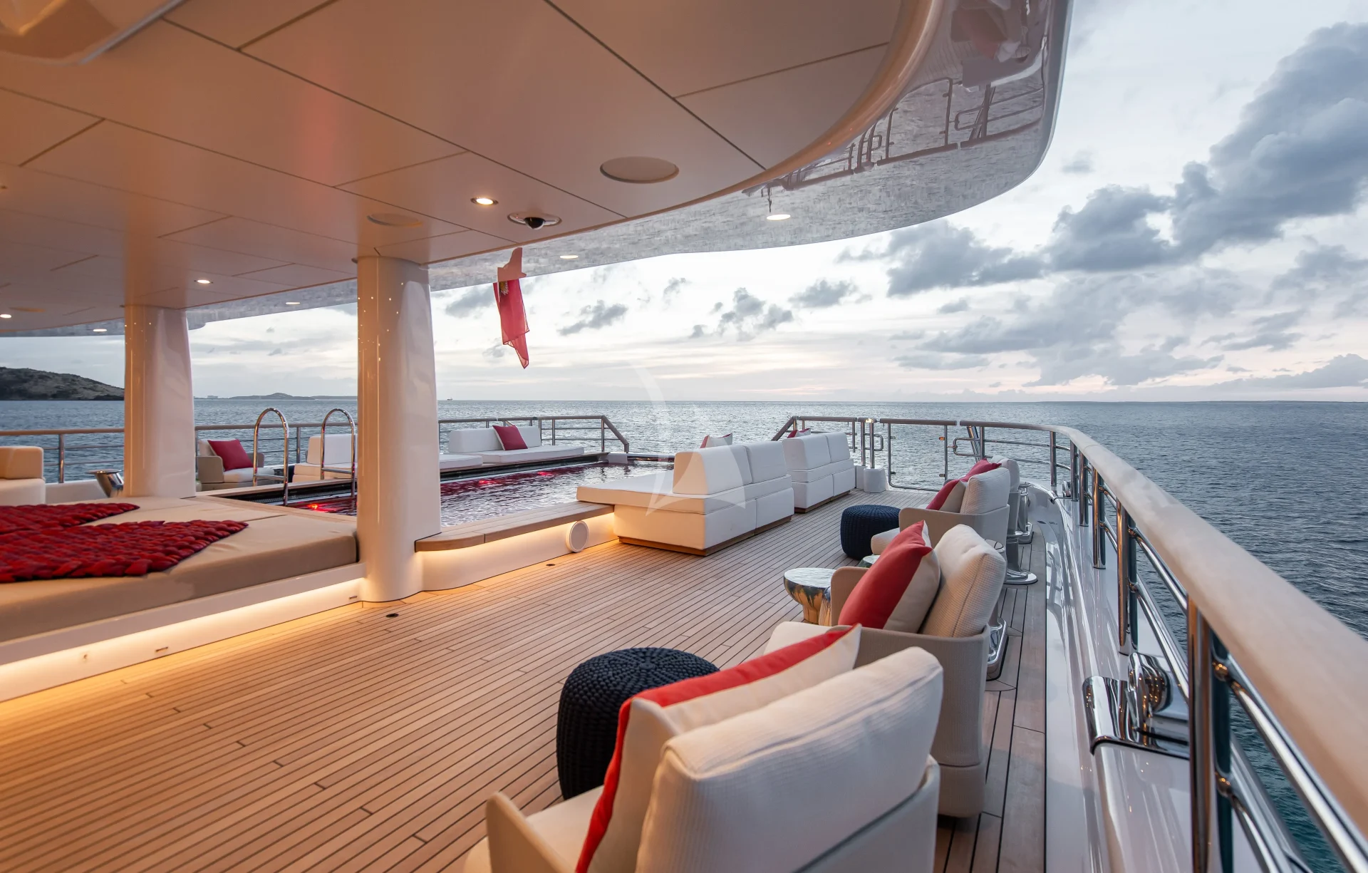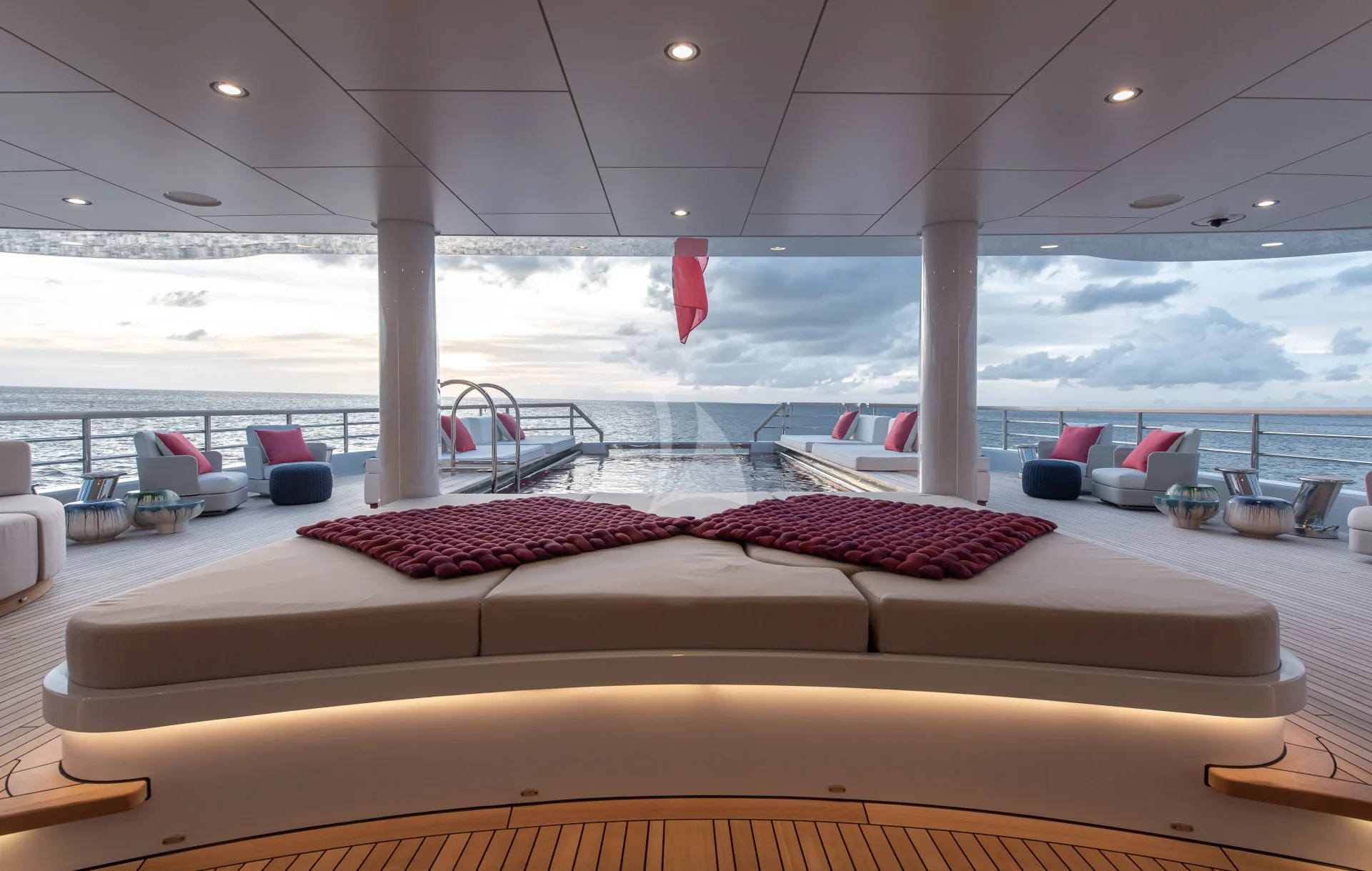 A signature feature of SYNTHESIS is her large aft deck pool with lounging areas around which combines with a very large main salon with bar and tv viewing areas, creating an exceptional flow of inside/outside areas.