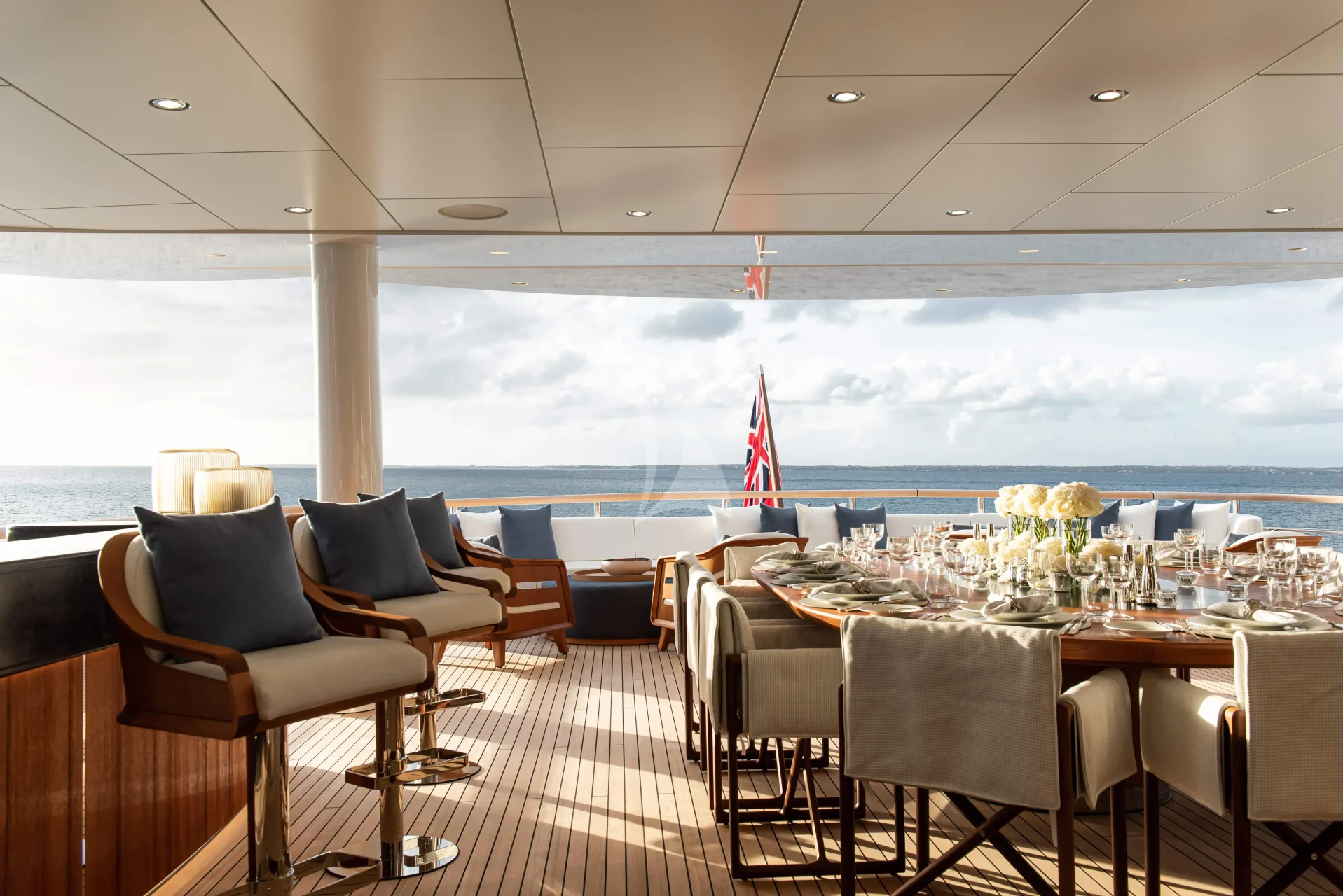 SYNTHESIS offers several other deck areas including sun deck with jacuzzi, seating/ lounging areas and gym equipment. The bridge deck aft that serves both as the perfect location for pre dinner drinks next to the adjacent dining room as well as a large outdoor cinema.