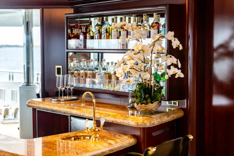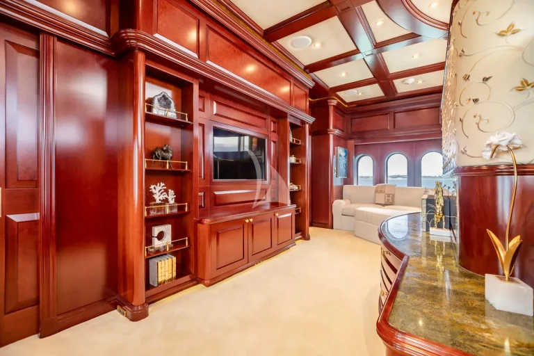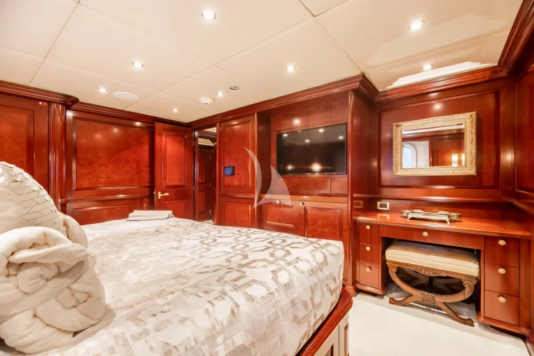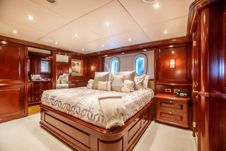 TCB accommodates up to 11 guests to spend restful nights in her five beautifully-appointed staterooms. The full-beam, split-level master suite is ideally suited for privacy. 180-degree views can be seen from the upper level, giving this space a flow of natural light. A unique feature of this stateroom is the intimate lounge on the lower level, perfect for taking a break from the action and unwinding in seclusion. A large his-and-hers en-suite is accessed through the lower level lounge and features a large Jacuzzi tub, vanity and shower. TCB’s additional accommodations include four en-suite staterooms on the lower deck, comprised of three king-size staterooms and one twin stateroom with a Pullman, perfect for accommodating small children. Each stateroom onboard showcases elegant styling as seen throughout the yacht’s interior.