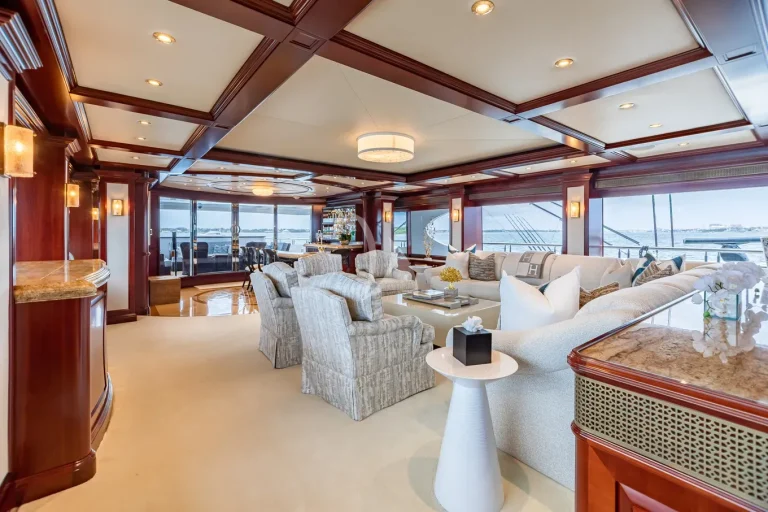 As guests step aboard, they will be greeted by TCB’s cozy aft deck, an ideal spot for settling in, sitting back and watching the embarkation port fade into the distance. In the mornings, the aft deck serves as the perfect locale for alfresco lounging with a morning coffee. Guests will find the stunning open-plan main salon and formal dining area through the sliding doors. Neutral-toned furnishings complement the wood accents that adorn the walls and ceiling. The superyacht’s main salon showcases an effortless blend of natural and ambient lighting, allowing the space to feel light and airy.