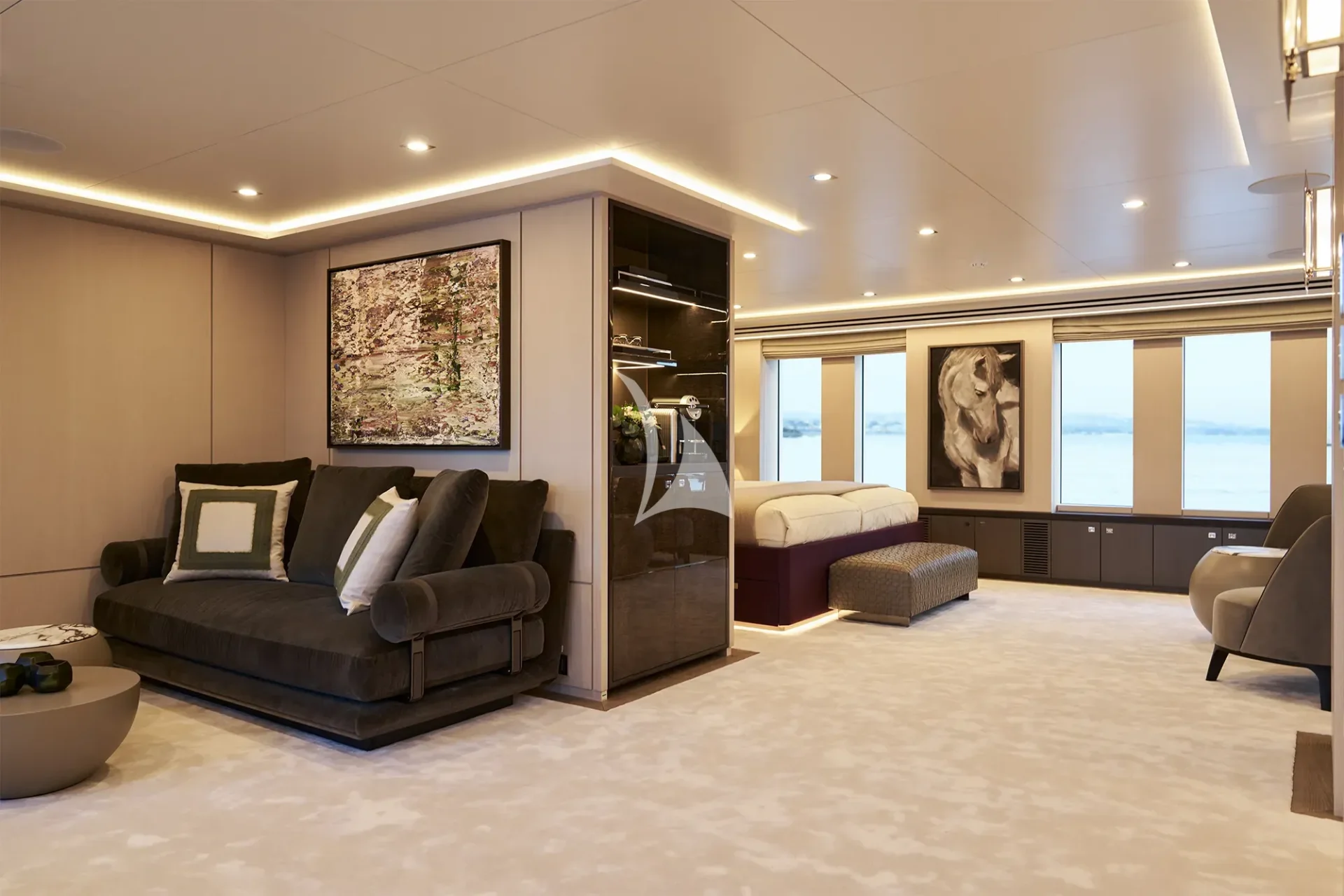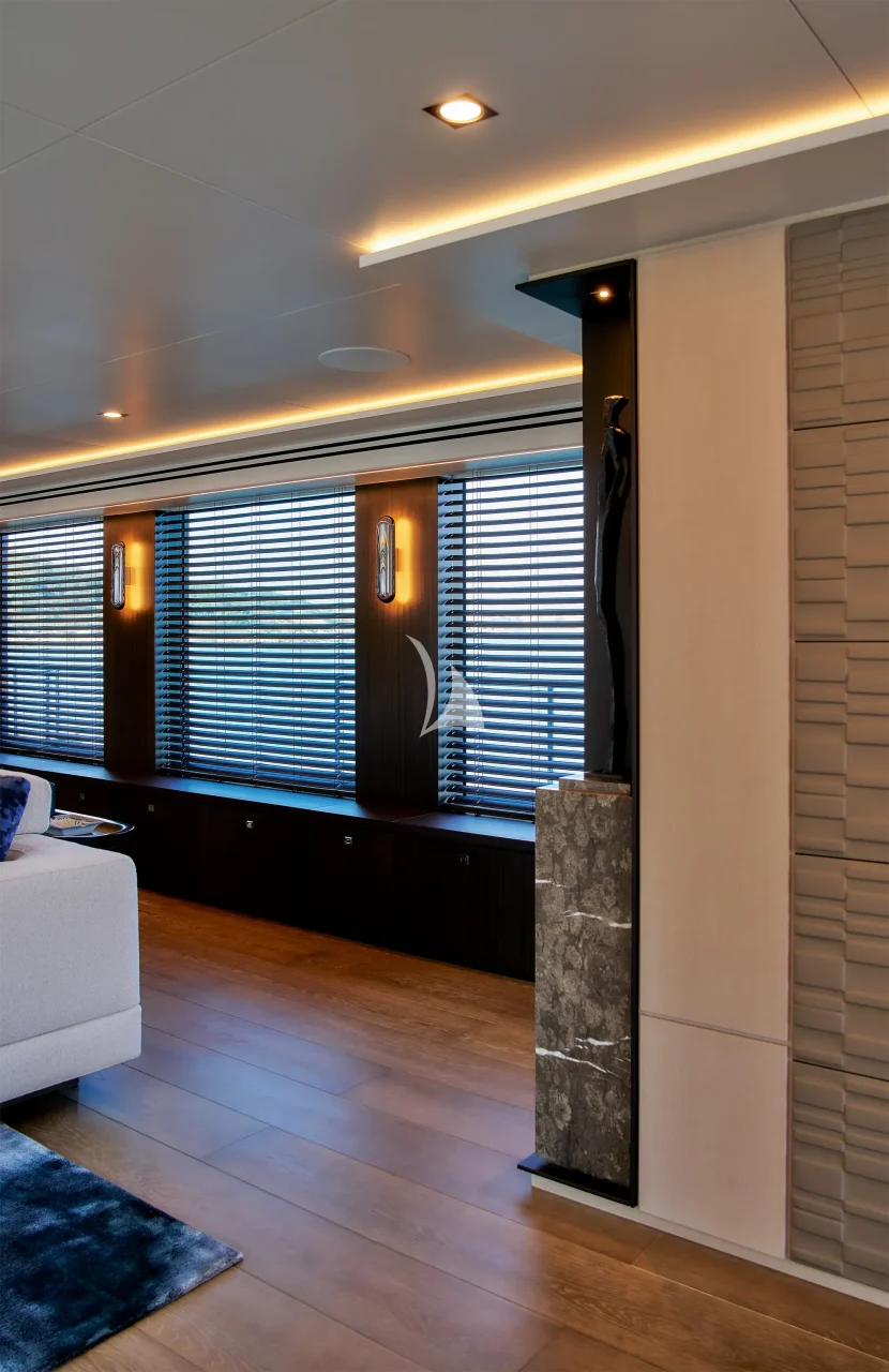 The main deck salon has large windows giving a lot of natural light. The cozy atmosphere is created by two beige sofas facing each other. Light wooden floor and white ceilings are in contrast to dark wood furniture, complimented by soft grey carpets and cushions. The salon leads to the lobby and further on to the master suite. Huge galley, storage rooms and a day head are also situated on the main deck.
