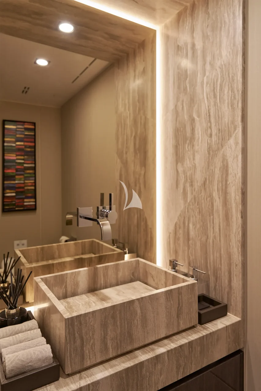 The lower deck accommodates guests in four luxurious cabins: two VIP cabins, one double cabin, each with a king-size bed, and one twin cabin. Every guest room is thoughtfully designed with high-end finishes and private en-suite bathrooms.