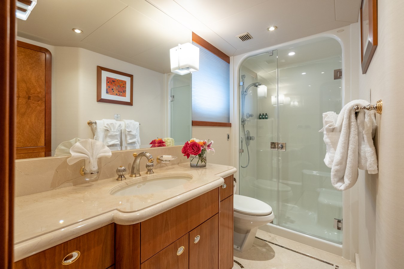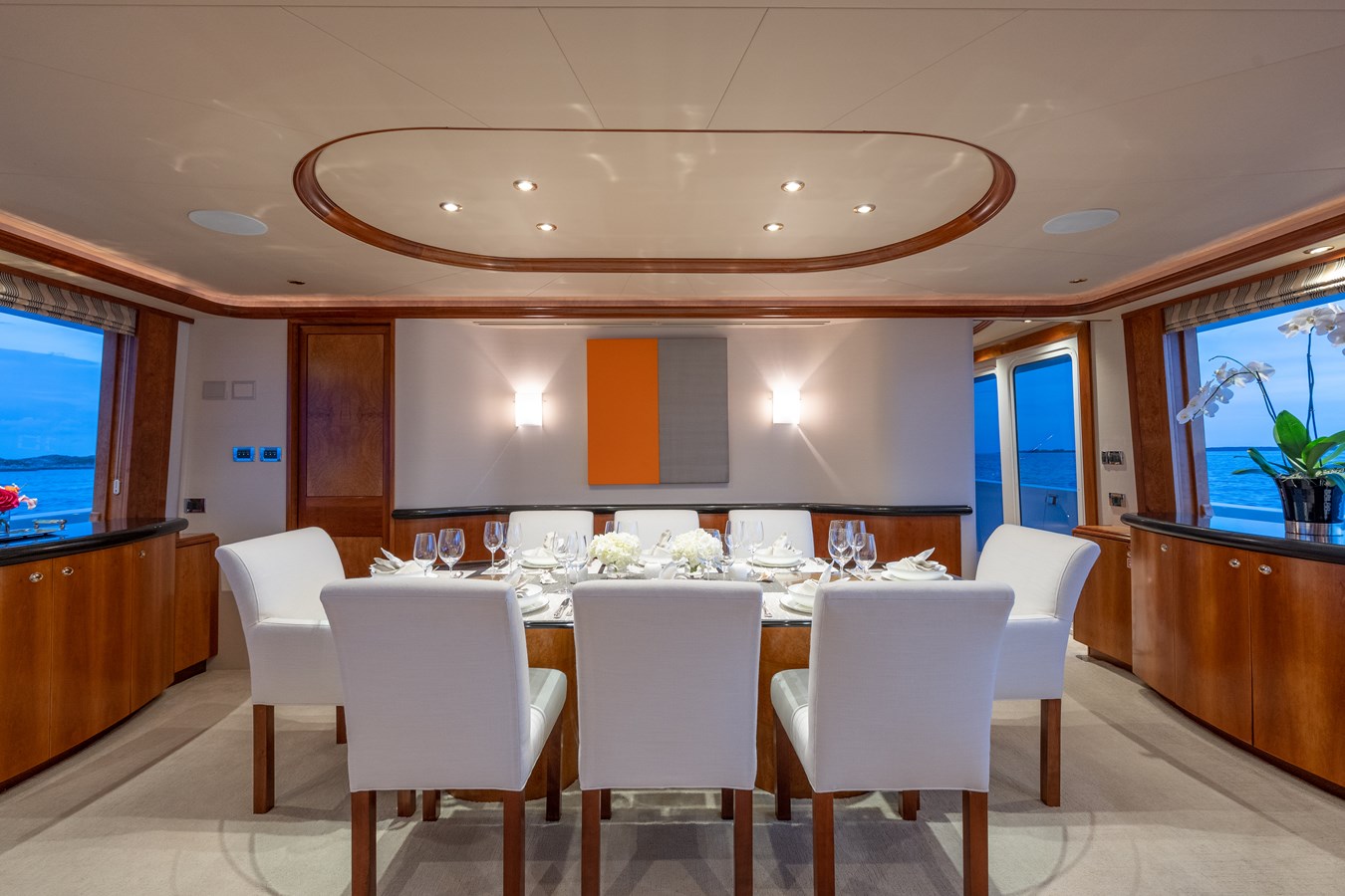 Her layout is designed for both comfort and entertainment, with a spacious main salon and separate dining area, a sky lounge with a games table and sit-up bar, and an expansive aft deck with circular dining, wet bar, and lounge seating. On the sundeck, guests can enjoy a Jacuzzi and sun pads with panoramic views.