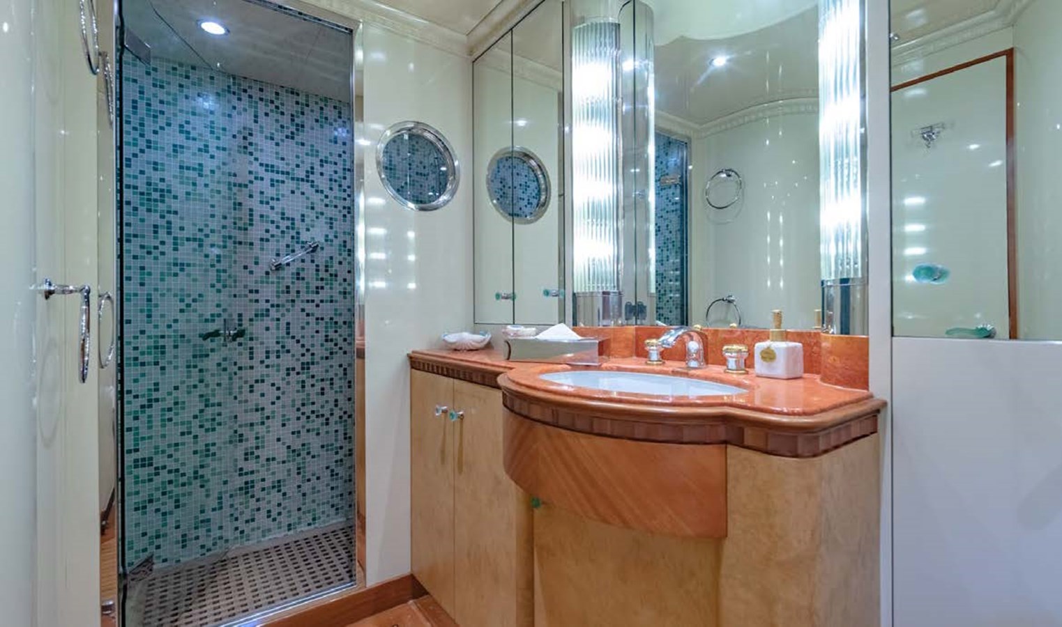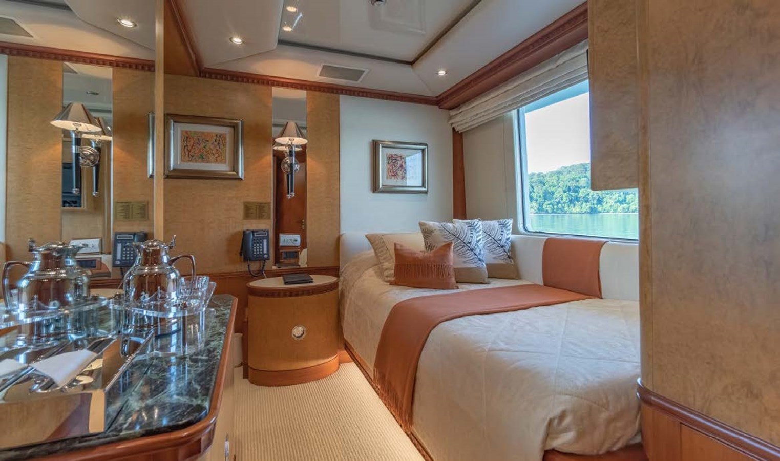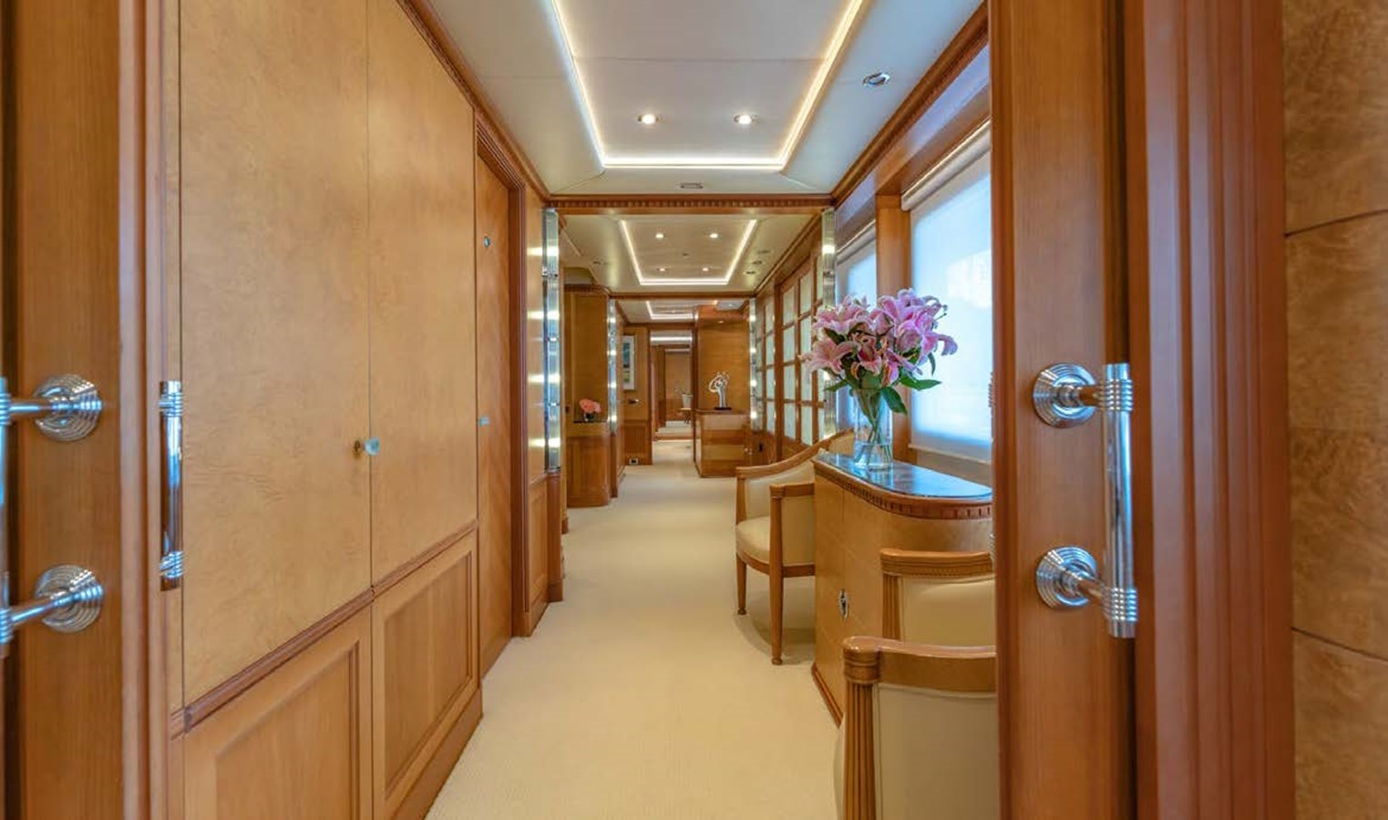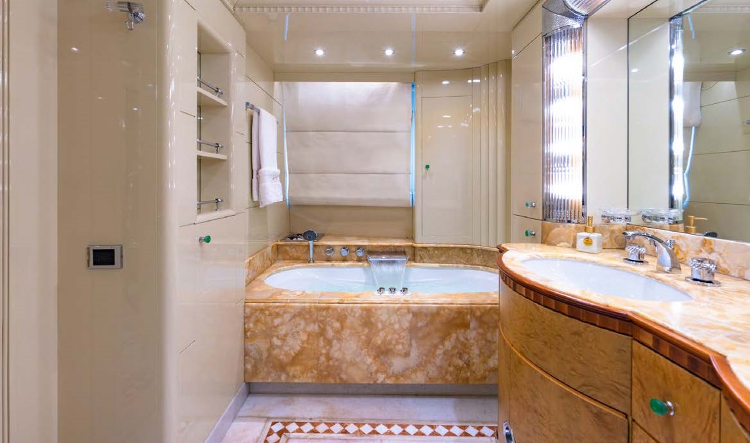 AZUL V accommodates six cabins. The full-beam master suite, forward on the main deck, has his and hers bathrooms, walk-in wardrobe, sofa, vanity table and a separate office area. There is a VIP suite on the lower deck with his and hers bathrooms, a walk-in wardrobe and a lounge. Accommodation is completed by a double cabin on the main deck, two twin cabins on the lower deck, and a single cabin on the bridge deck.