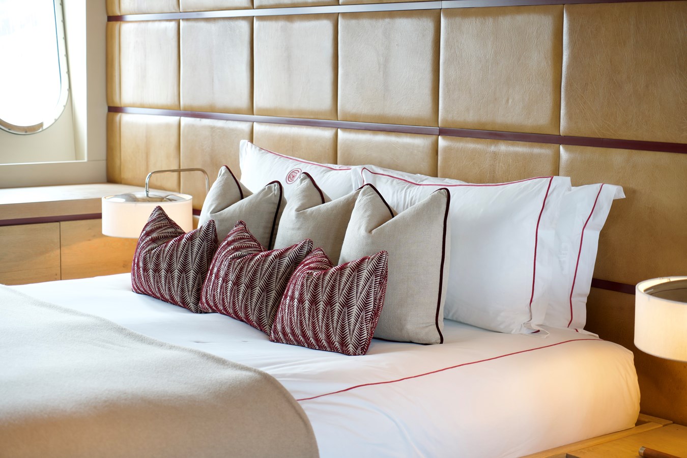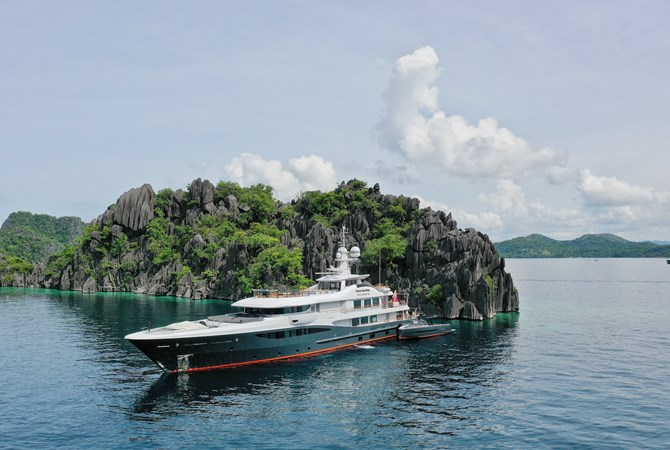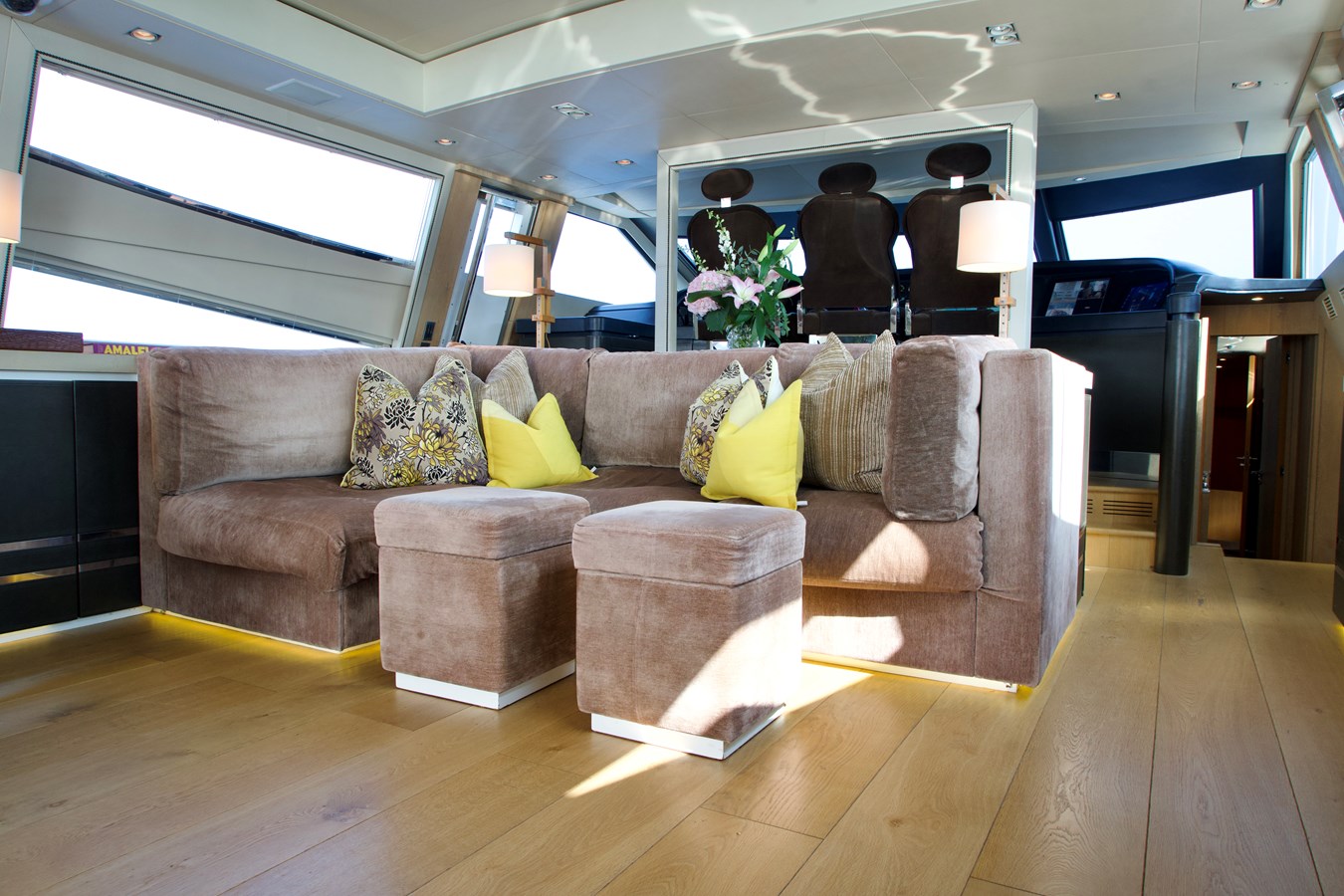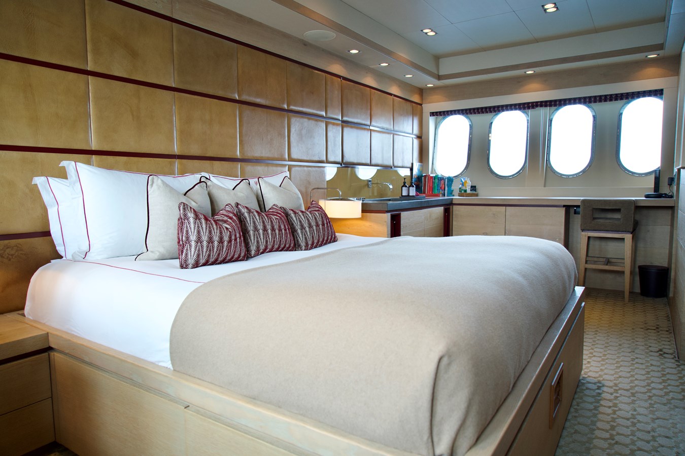 The interior is designed by Rodriquez Interiors and Tara Bernerd & Partners with meticulous attention to detail, featuring custom materials such as distressed oak flooring. Accommodation is offered for up to 10 guests in 4 versatile staterooms, including a full-beam master suite, VIP with private spiral staircase to the cinema lounge, and two twin cabins with Pullmans. A fifth media lounge can be converted into a double cabin, offering flexible guest arrangements. Crew quarters sleep 6.