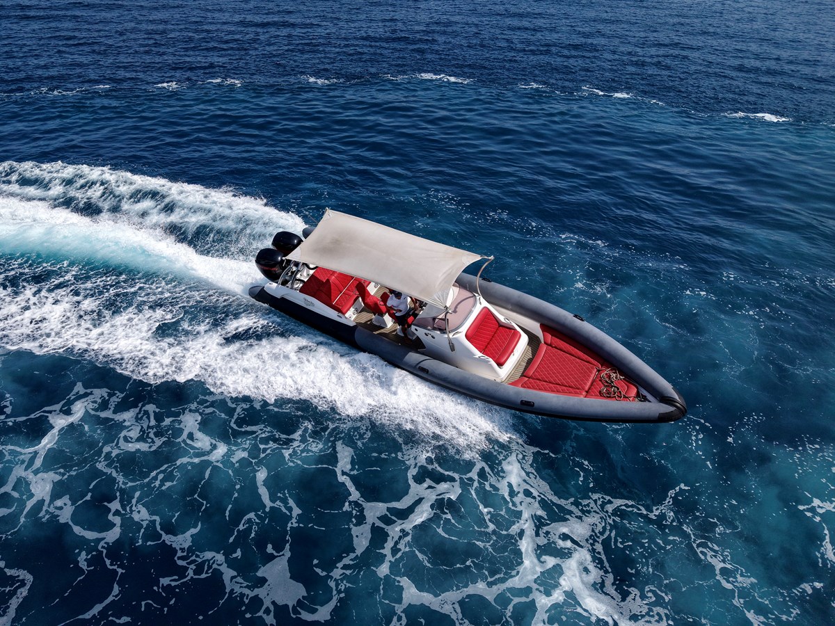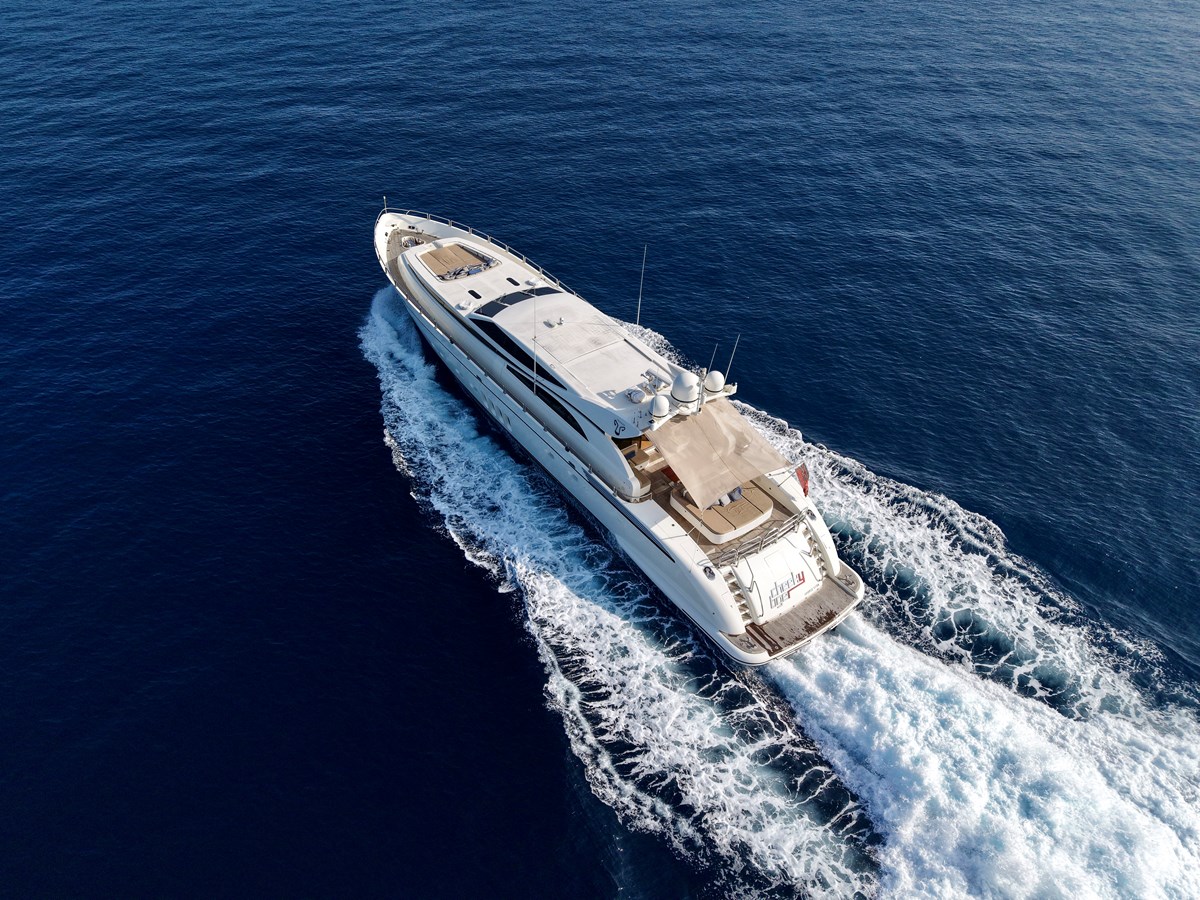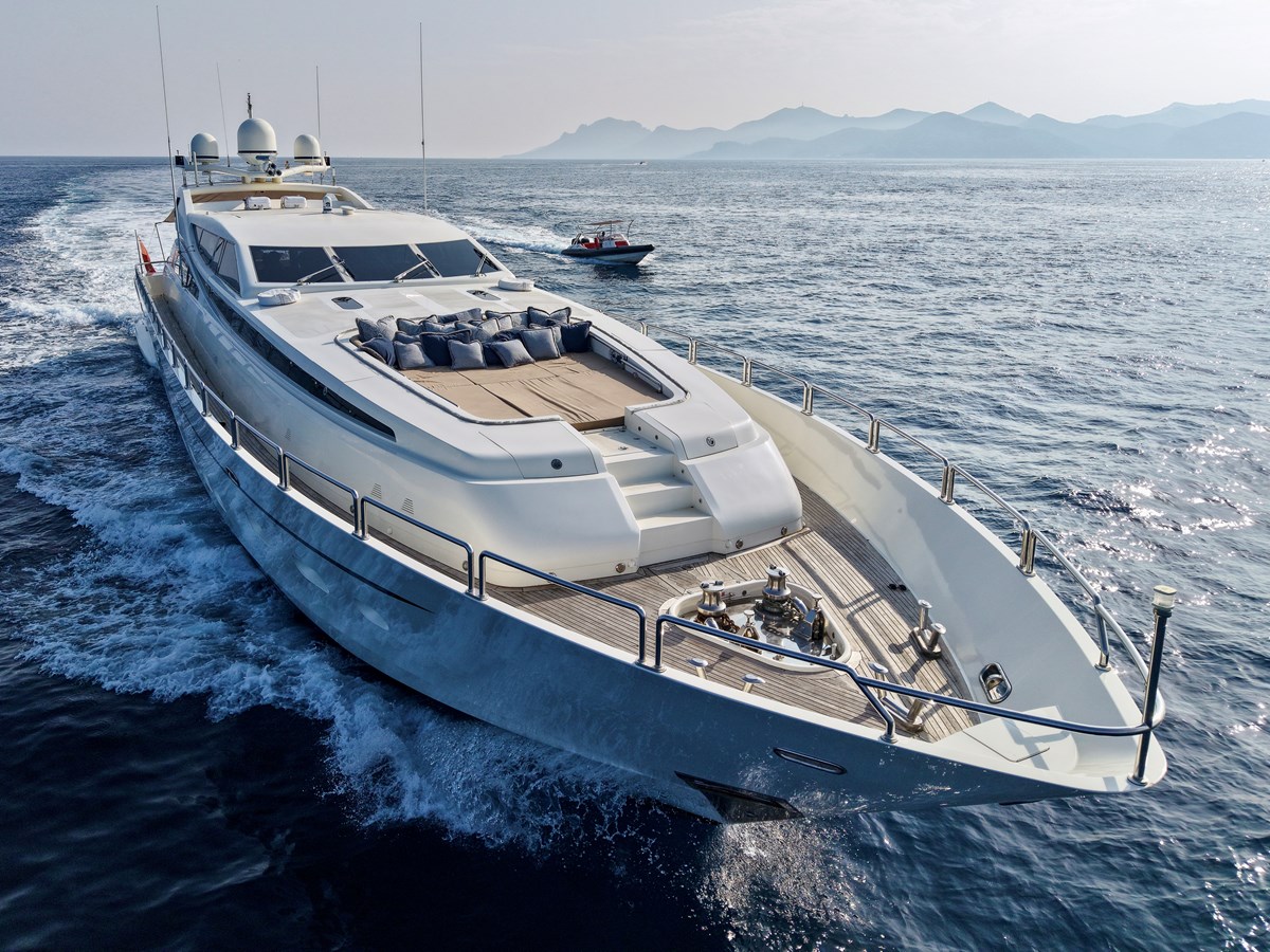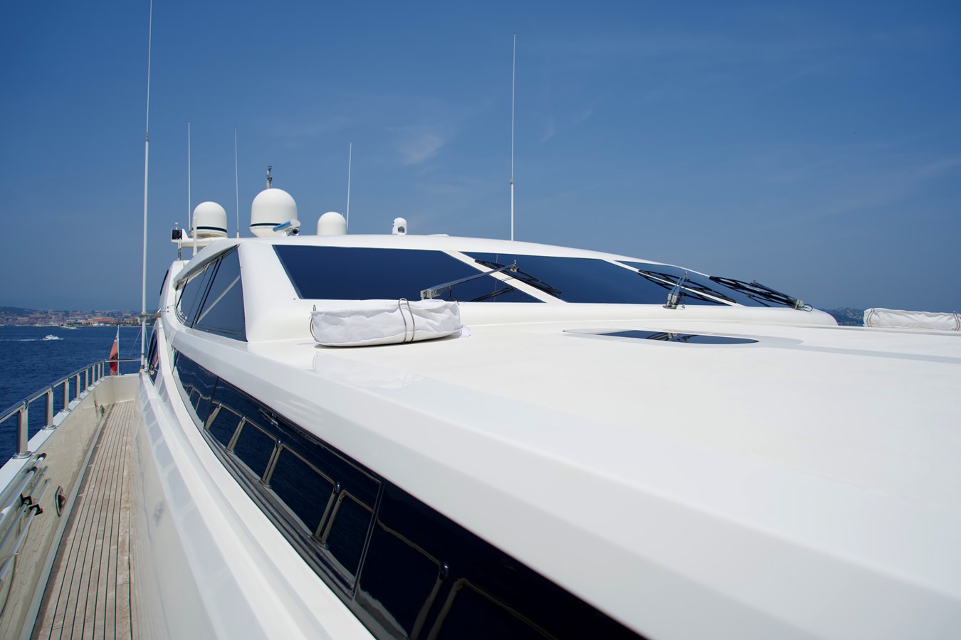 On deck, guests enjoy expansive sunpads forward and aft, an alfresco dining area, and a large retractable sunroof in the main salon that opens the interior to natural light and sea breeze. The yacht is equipped with a full complement of water toys, including a Ribeye tender (available upon separate negotiation), Seabobs, wakeboards, snorkeling gear, and inflatables.