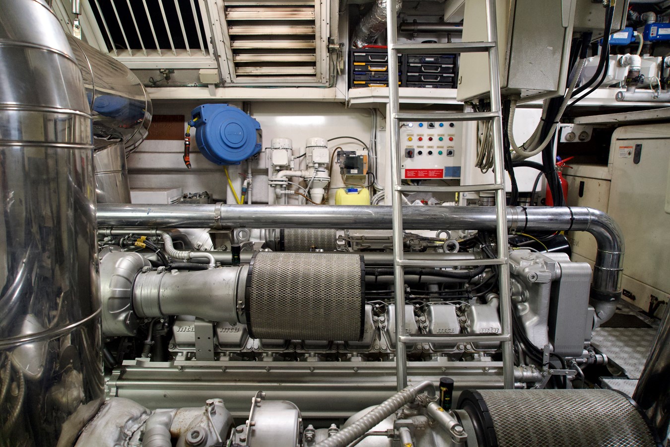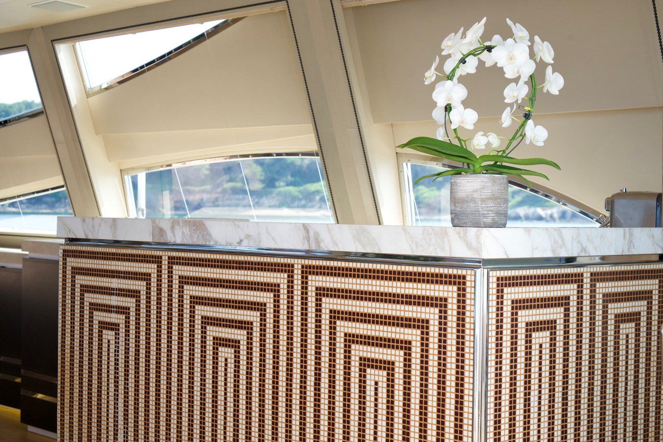 Her sleek, sporty architecture designed by Andrea Bacigalupo is matched by a shallow 1.2m draft—ideal for cruising close to shore in the Mediterranean. Powered by triple MTU M91 engines, CHEEKY TIGER reaches exhilarating top speeds of over 35 knots and cruises comfortably at 28–30 knots.