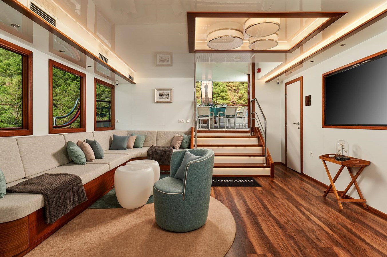 Commercially registered under the Croatian flag and built according to the MCA LY3 code, supervised by Croatian Shipping Register for short range navigation, S/Y Corsario has an impressive interior volume of 339 GT with a very smart layout. Her saloon hosts a 12 guests dining table, two separated lounge areas and a fully equipped bar. She can accommodate up to 12 guests ini 6 luxury cabins, including two vast cabins (Master & VIP) with ensuite floor heating bathroom, 2 Double bed cabins with ensuite bathroom and 2 Twin cabins with ensuite bathroom.