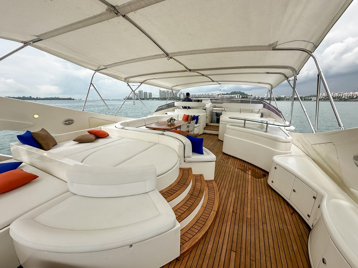 Externally, the yacht is equally impressive, boasting a spectacular flybridge with ample seating and lounging areas, a generously sized cockpit for alfresco dining, and expansive sunbathing space on the bow, ensuring plenty of options for outdoor enjoyment.