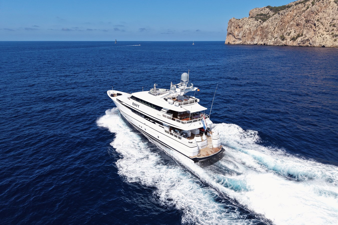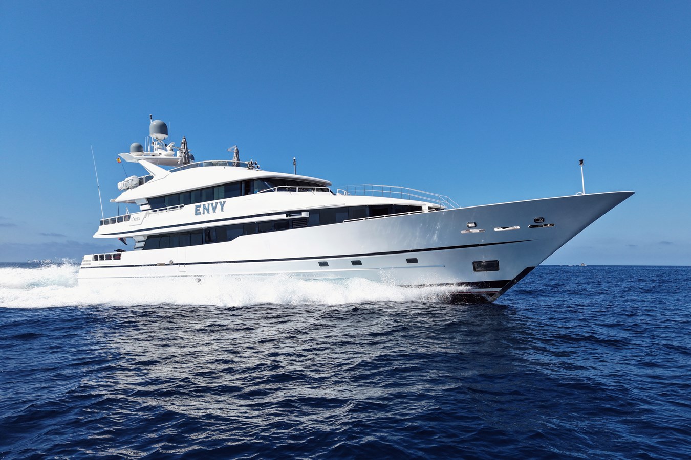 ENVY accommodates up to 8 guests in 4 classically appointed staterooms, including a full-beam master suite. Key features include a modern at-anchor stabilisation system, two full-beam salons with panoramic views, and a large aft deck tender and ski storage area.