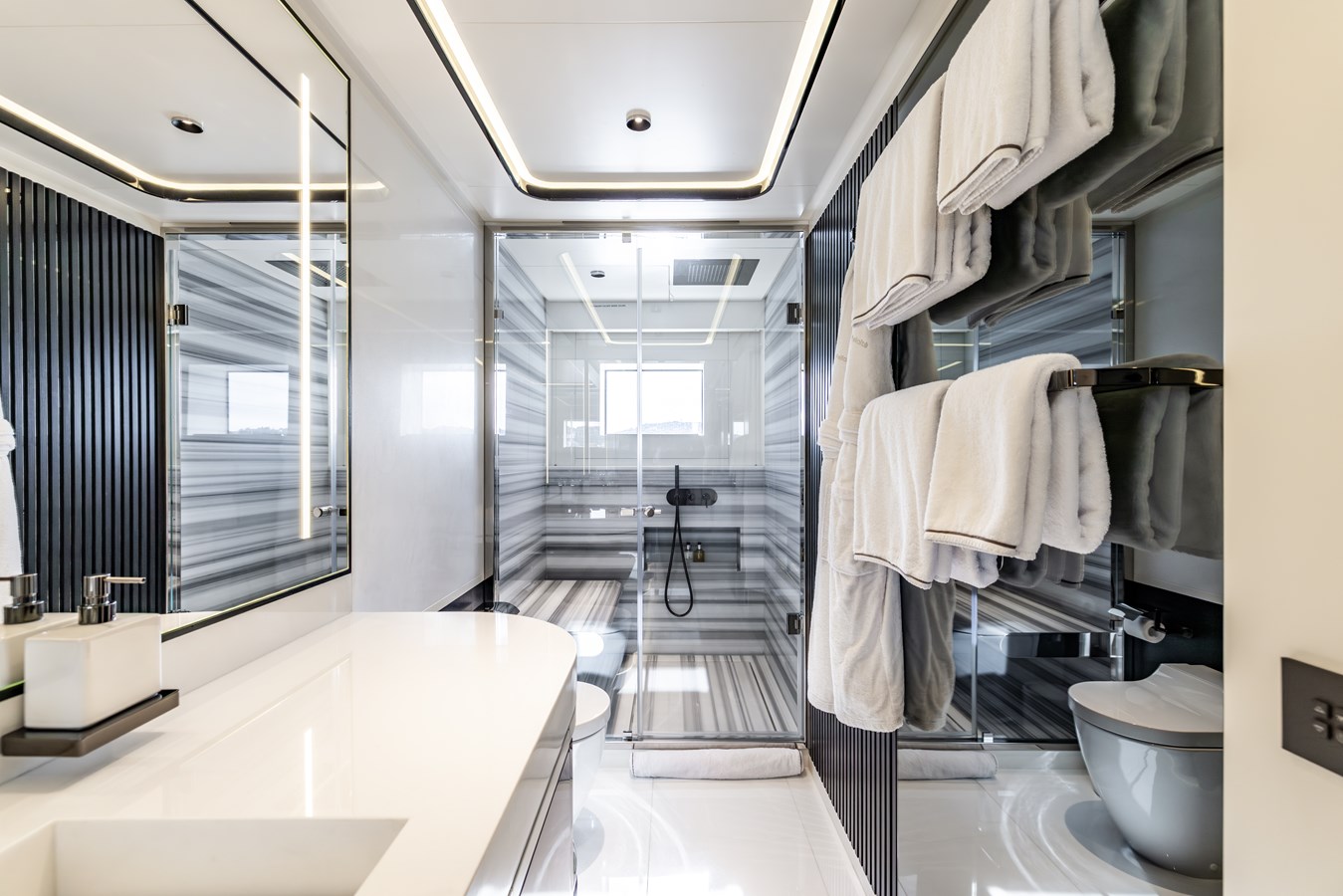 Accommodation is for 12 guests in five cabins, including a full-beam master suite on the main deck with a private sea-level terrace. The lower deck hosts a fully equipped gym, two doubles and two twins with Pullman berths, providing flexibility for family or charter use. Crew quarters forward accommodate a professional team of 11, supporting seamless, discreet service.