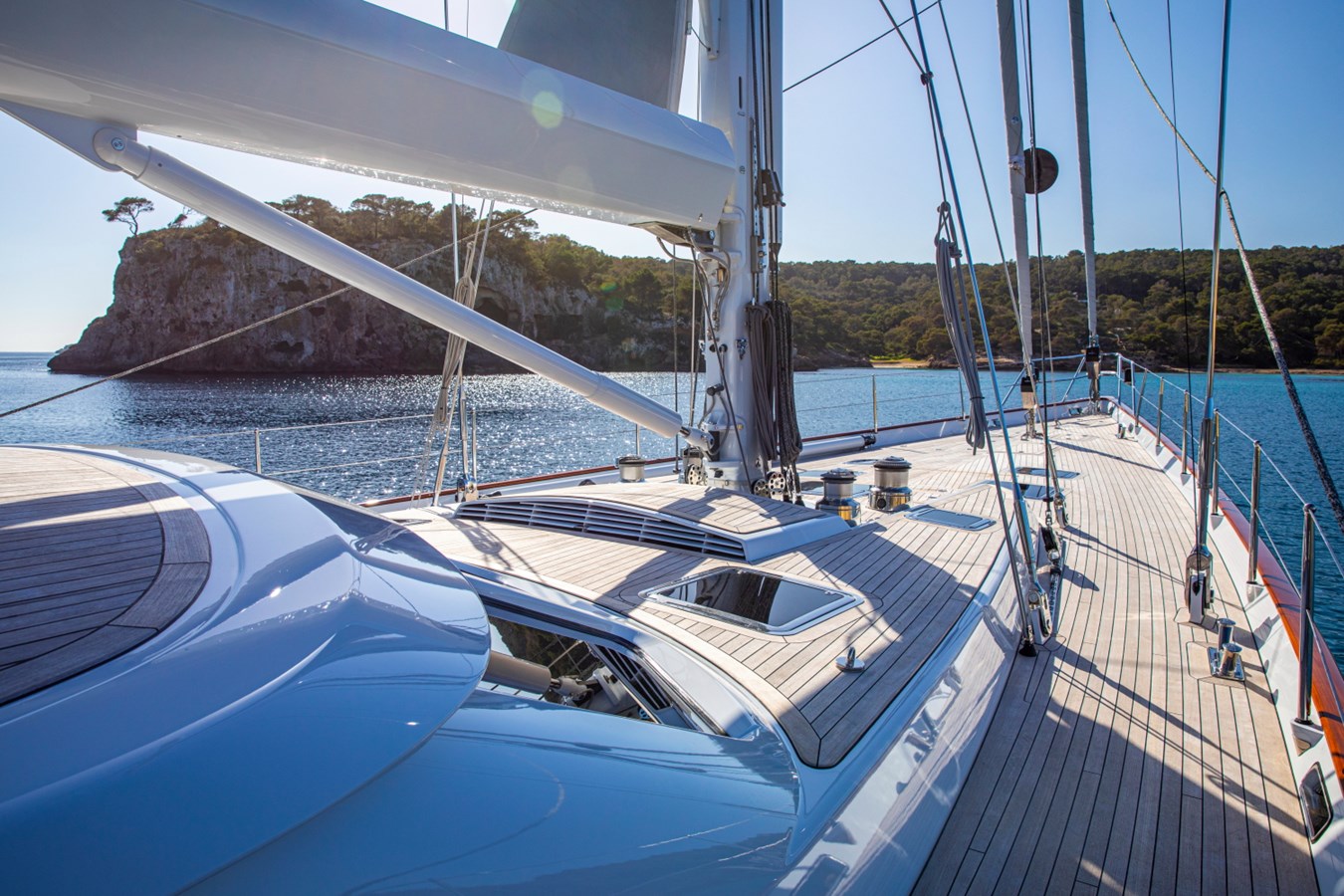 A standout feature is her dual-cockpit layout, offering both a private owner’s cockpit aft and a spacious center cockpit ideal for socializing, dining, and comfortable sailing. The helm is positioned just aft, with easy access to the side decks.