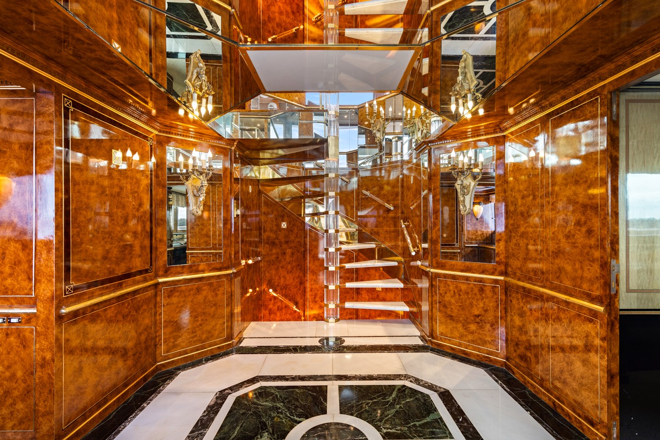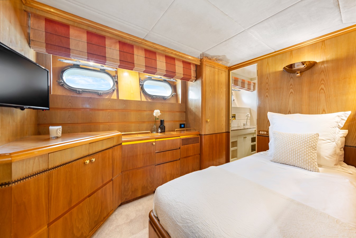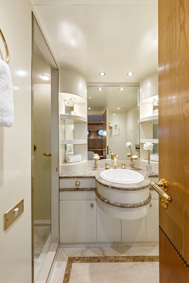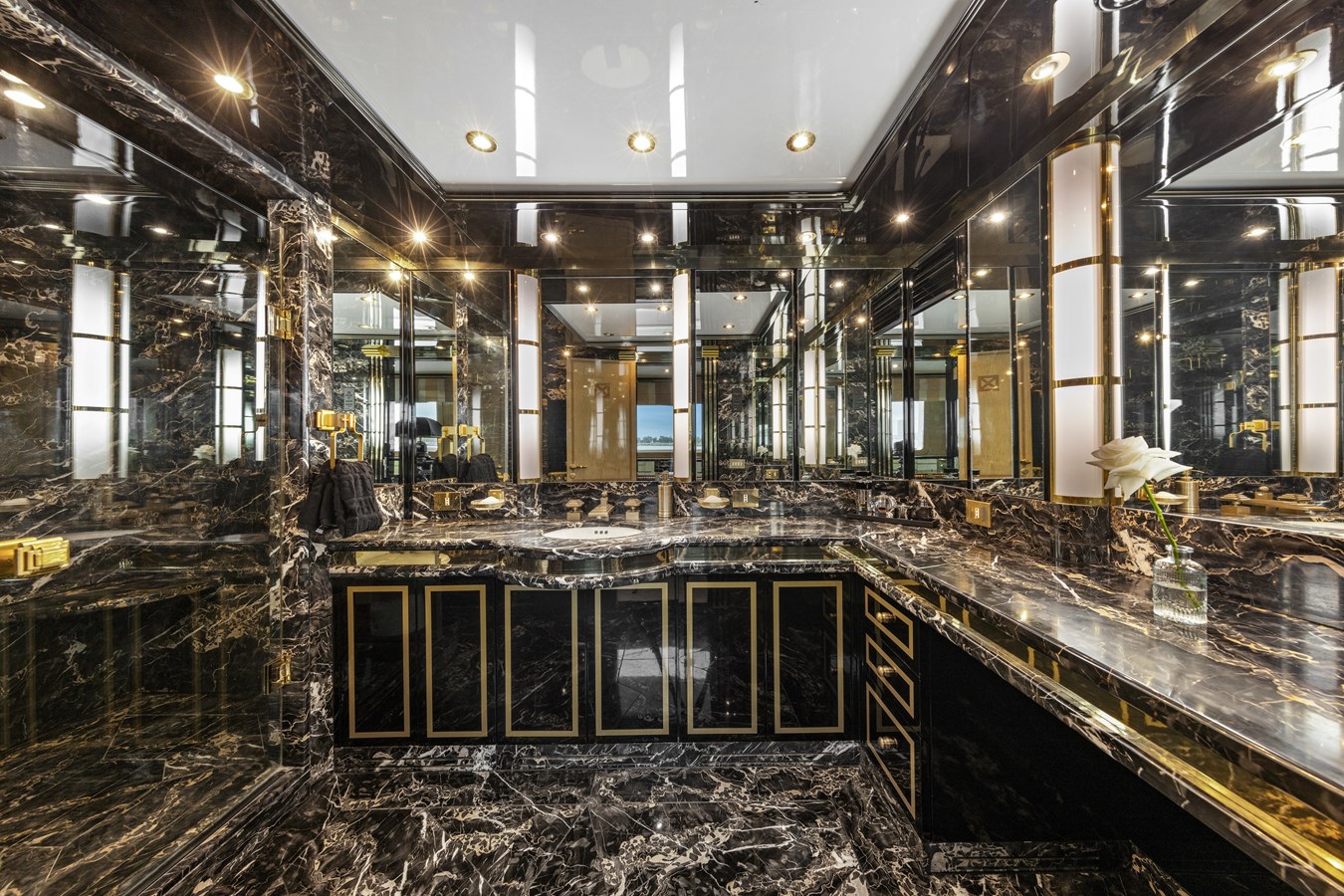 ‘MISTRESS’ showcases luxurious materials and bespoke finishes throughout. A standout feature is the master bathroom, adorned with rare porte gold marble sourced from Italy and Corsica. This exquisite stone, with its striking black and gold veins, embodies the yacht’s dedication to unparalleled detail.