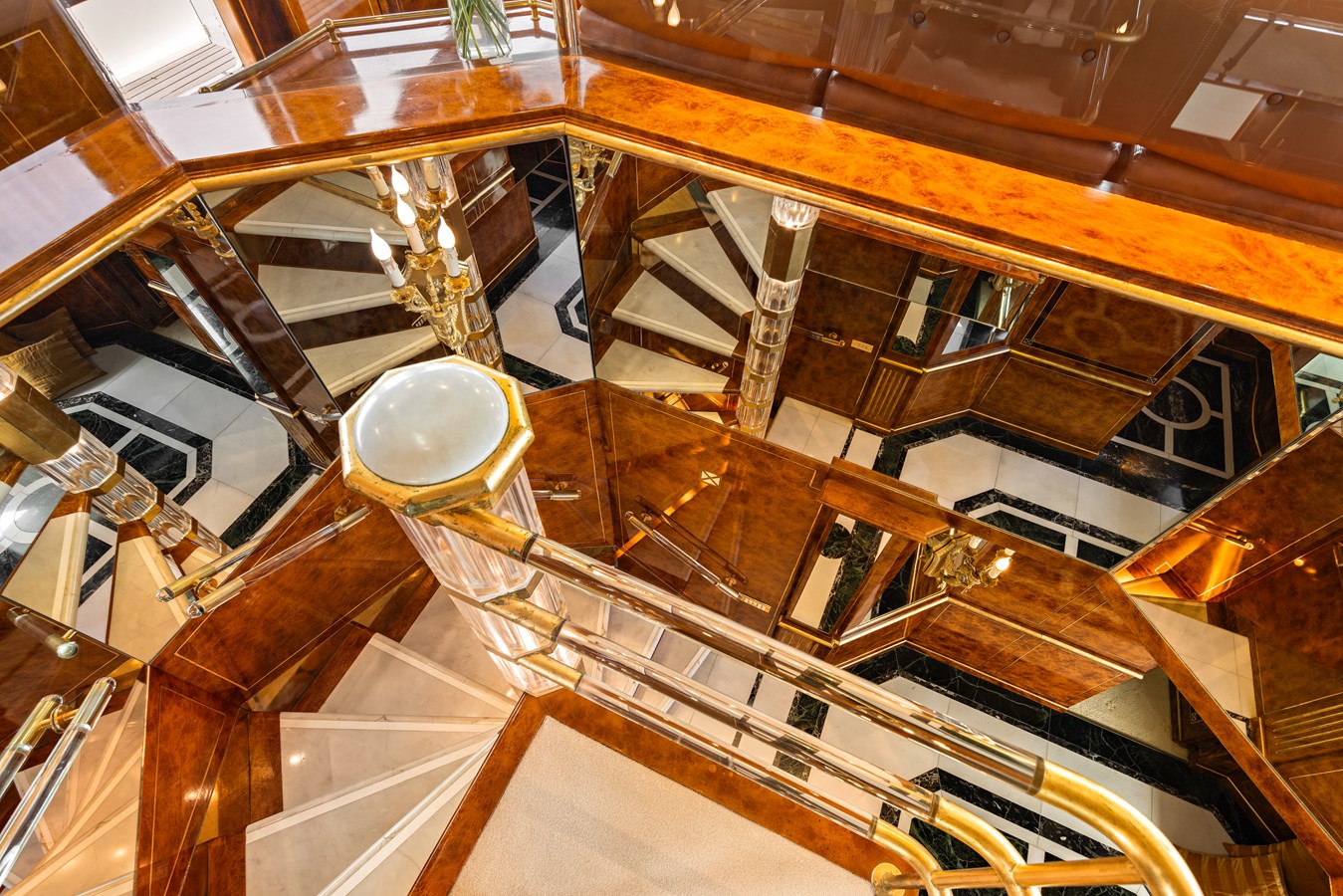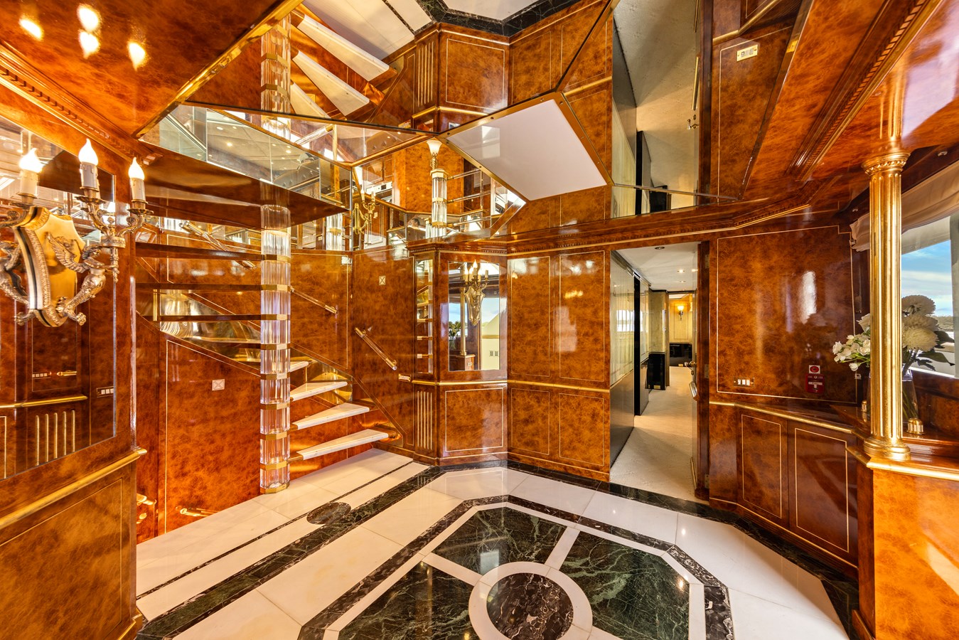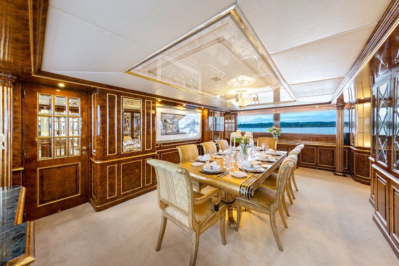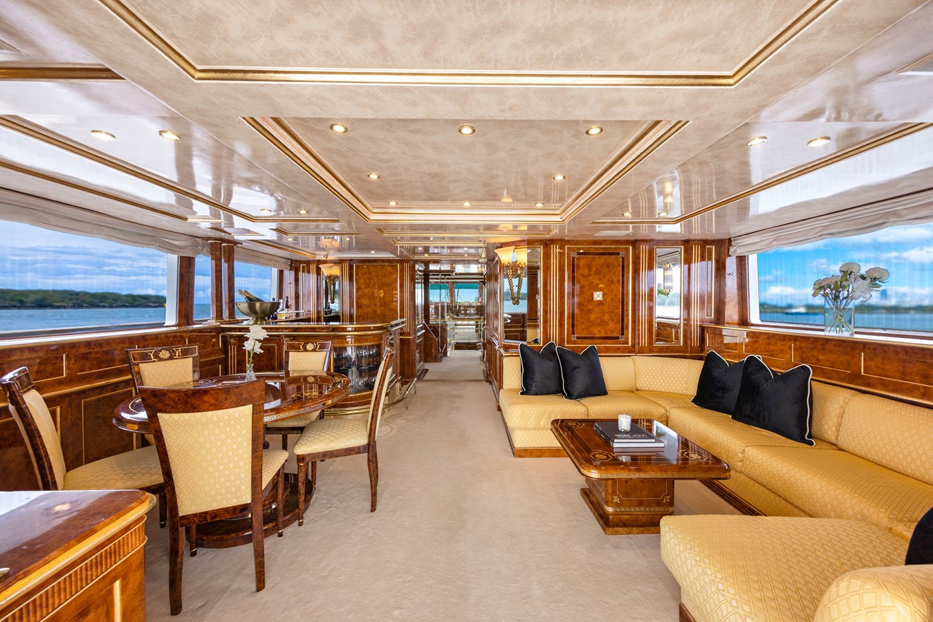 Stepping aboard ‘MISTRESS’ is an invitation to experience true opulence. The main salon envelops guests in hues of yellow and gold, radiating warmth and refinement. Two expansive sofas and three armchairs are positioned to welcome intimate conversations, with natural light streaming through large windows. Soft lighting adds to the ambiance, creating a serene retreat.
