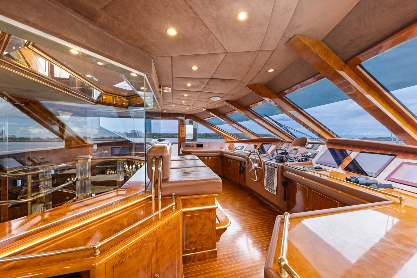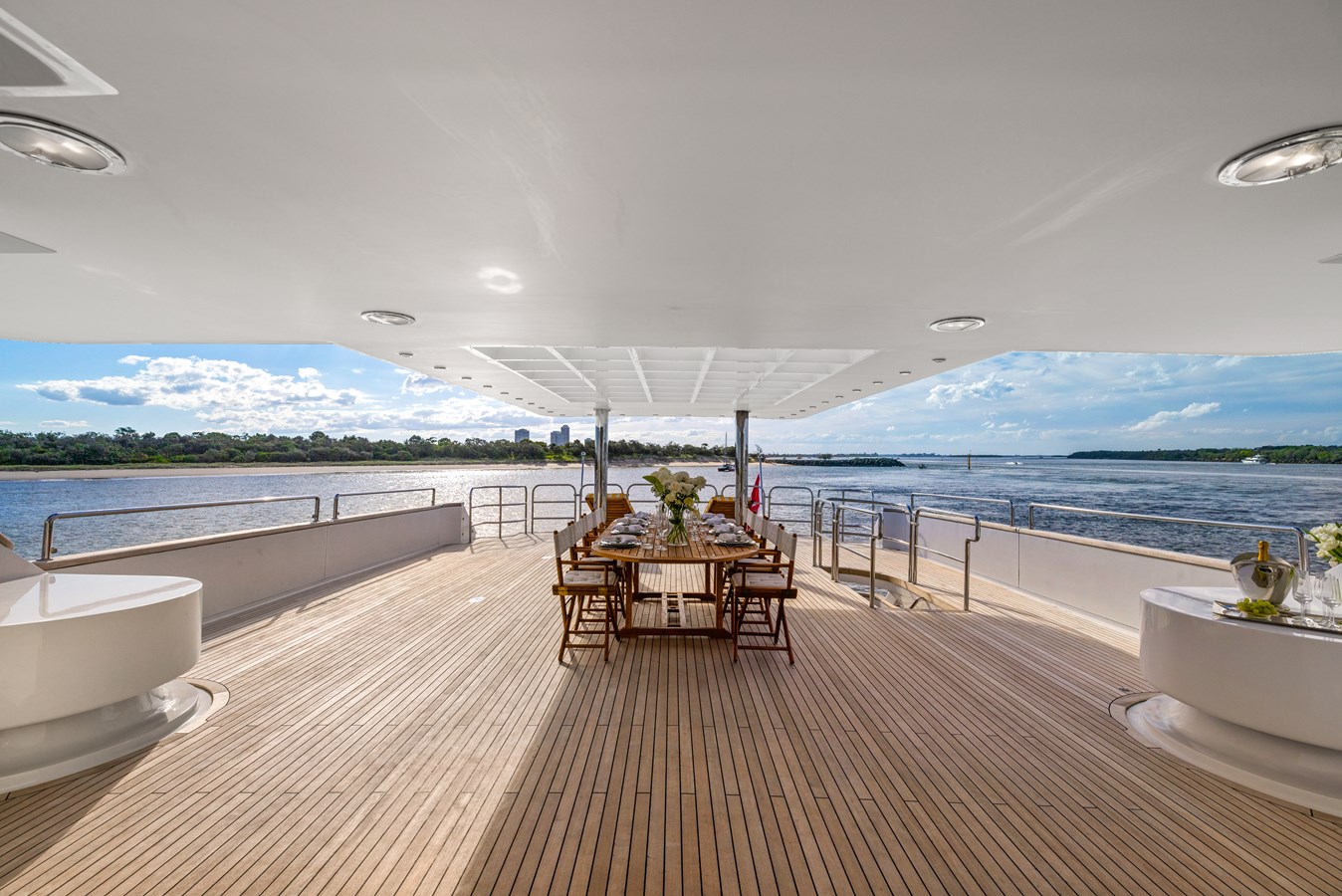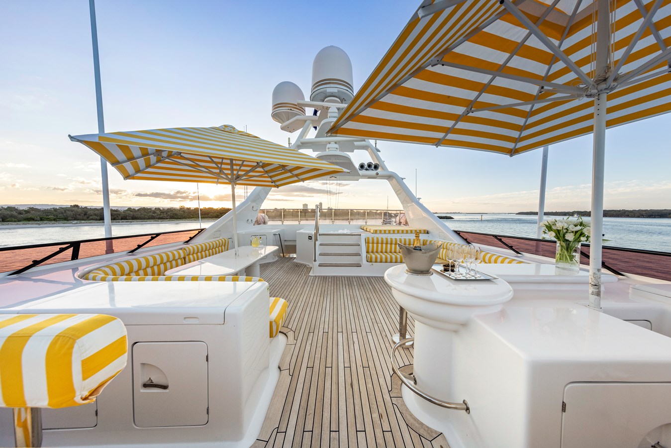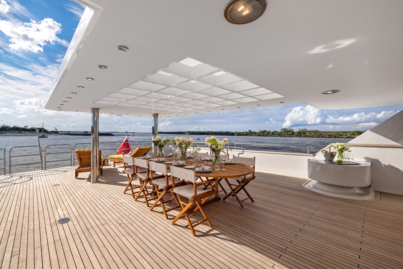 The upper deck sky lounge offers a mix of relaxation and indulgence, featuring ornate furnishings, a glamorous bar, and classic paneling. Outside, an alfresco dining area seats up to ten guests, offering panoramic views of the seascape. Aft, spacious seating provides the perfect spot to unwind and enjoy the sea breeze.