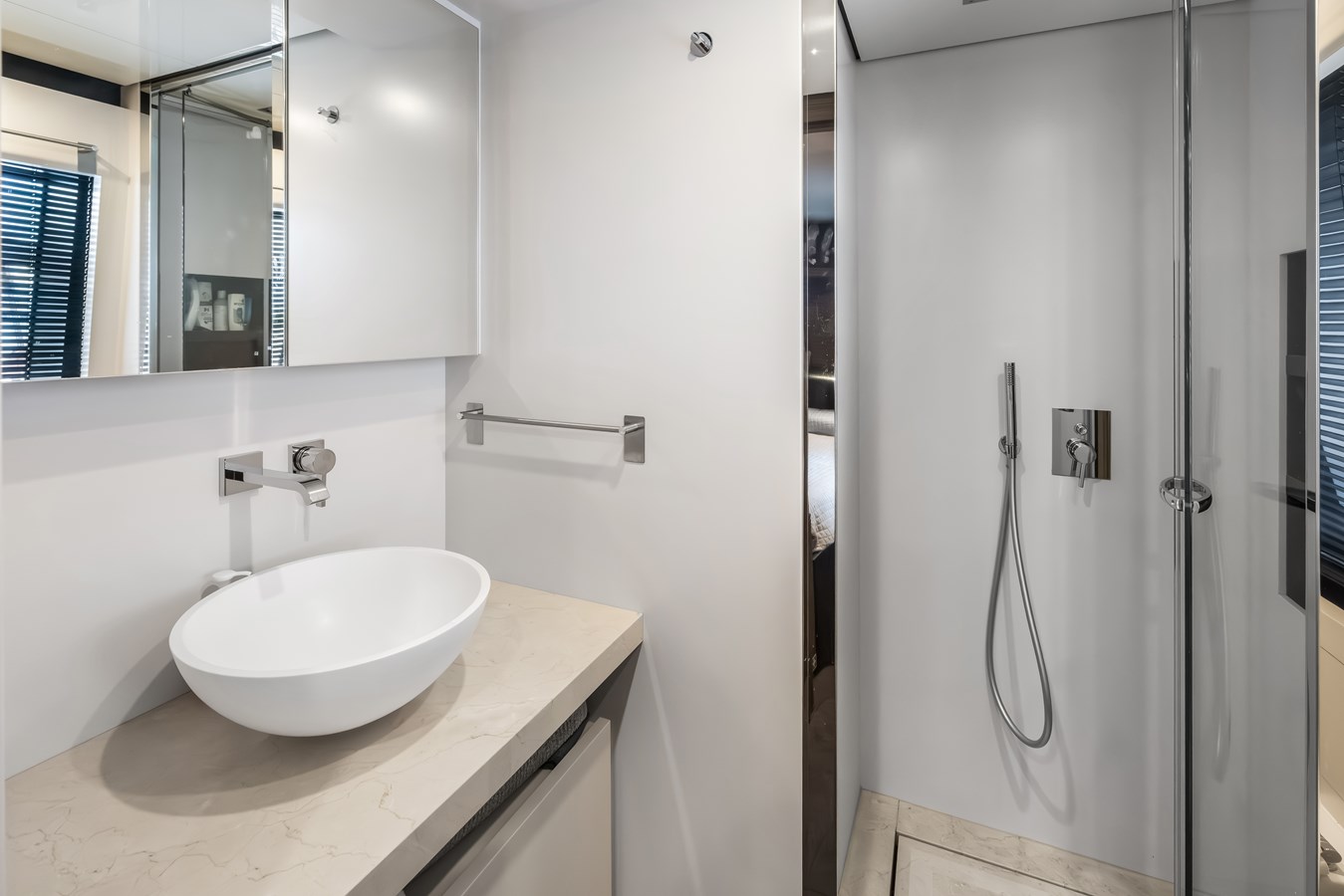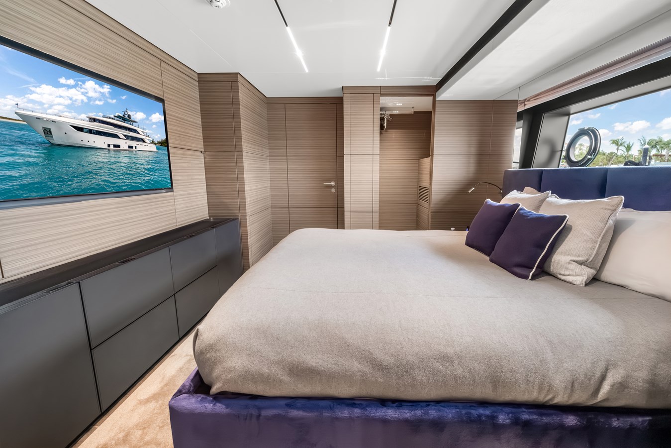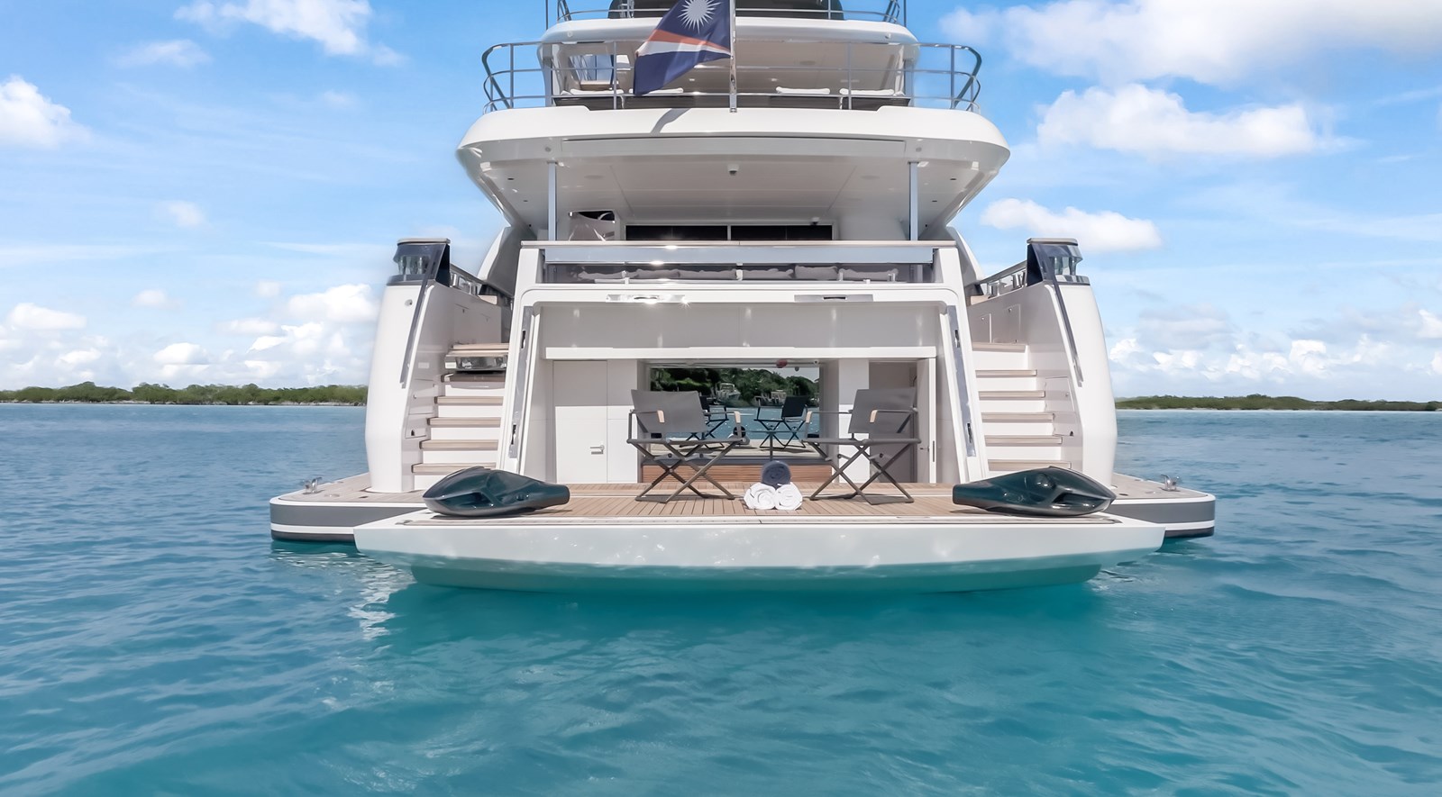 Inside and out, her custom configuration was designed for elite, uncompromising comfort for up to 10 guests. Standout features include a spectacular drop-down electric balcony off the main deck , a sprawling sun deck complete with an extended Jacuzzi pool and Teppanyaki grill , and an incredible Invisible Black marble upgrade sweeping through the luxurious en-suites. At the water’s edge, the transom folds down to reveal a massive, teak-laid beach club perfectly outfitted for entertaining with a custom bar, icemaker, and an additional freezer. Equipped with a high-capacity Atlas shore power converter for seamless global cruising, she is a turnkey masterpiece ready for her next owner.