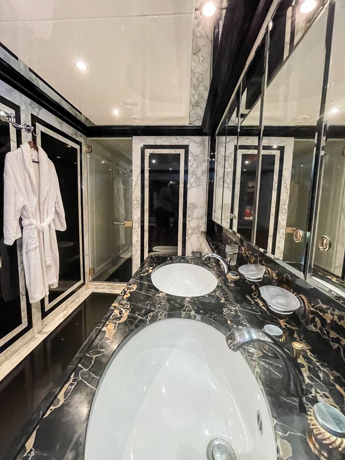 Obsessions is powered by twin MTU 3500hp turbodiesels, with a design top speed over 30 knots. While the hull is designed to showcase impressive speed for a yacht of this size, at 8 knots Obsessions can achieve a range of over 6000 nautical miles, giving incredible versatility of use. In terms of guest sleeping accommodations, Obsessions has a Master stateroom, VIP stateroom, a port cabin, and starboard cabin. Crew accommodations are: Captain’s cabin (2 bunks), Engineer’s cabin (2 bunks), Forward cabin (2 bunks), and a crew lounge. For more information on this iconic superyacht, please contact us today.