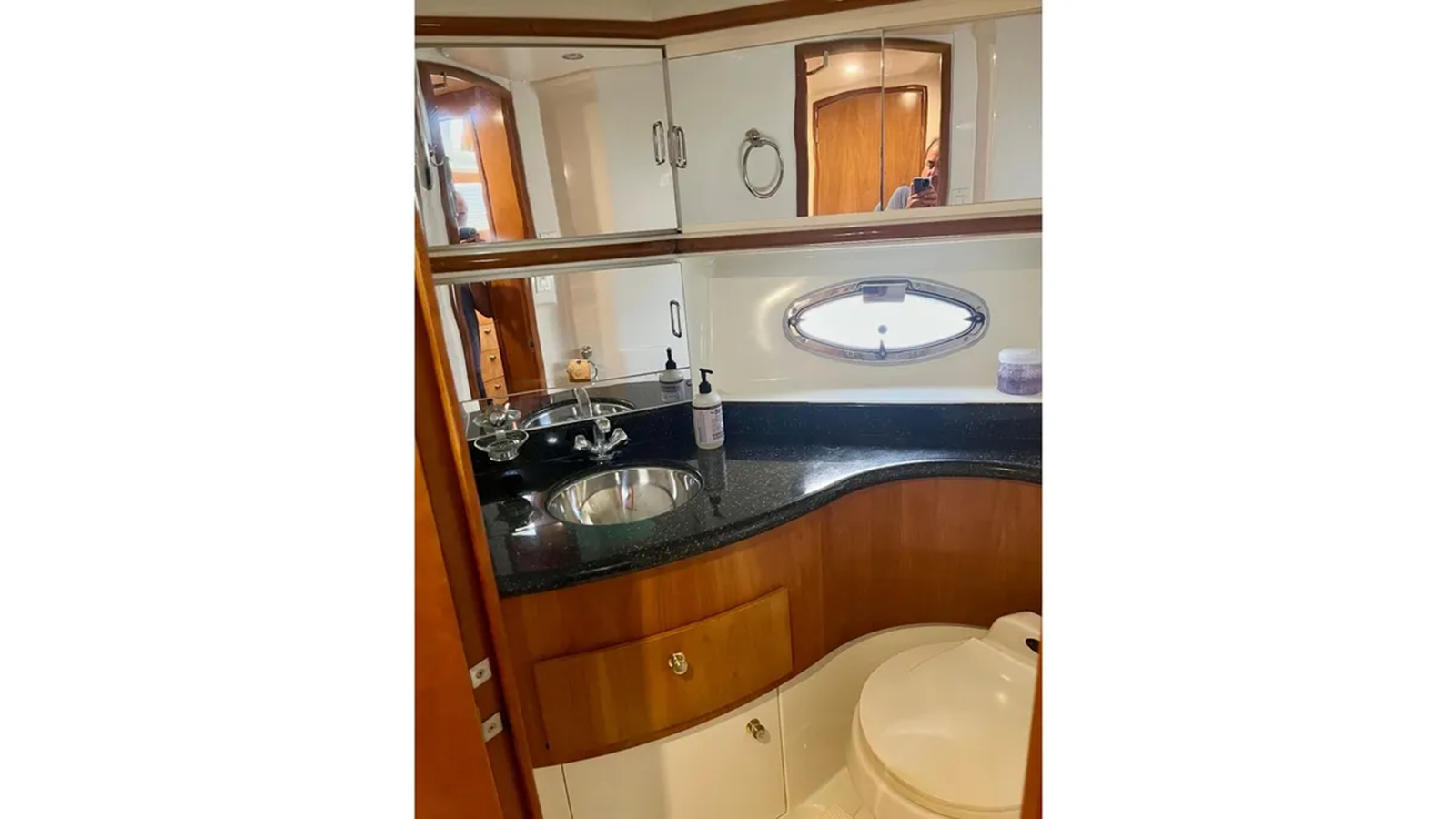 Below, the yacht features two private staterooms and two full heads, providing excellent separation and privacy. The master aft stateroom is particularly impressive, with abundant storage and en suite head access. The forward stateroom also enjoys direct access to a head with separate shower and toilet compartments, a standout feature in this class.
