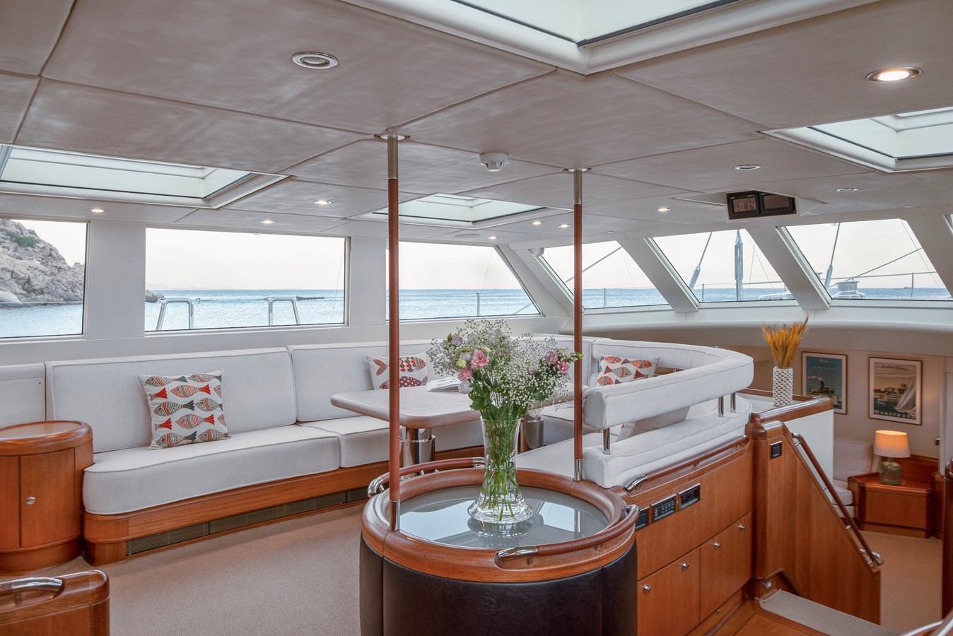 SURAMA’s cool, relaxing, modern interior is uncluttered and maximises natural light wherever possible. The deckhouse lounge’s wraparound windows and skylights pour light into the informal dining area where guests can enjoy the views from the comfort of their sofas. Steps lead down to the main saloon which has a large, semi-circular seating area and TV to port and an informal dining area to starboard.