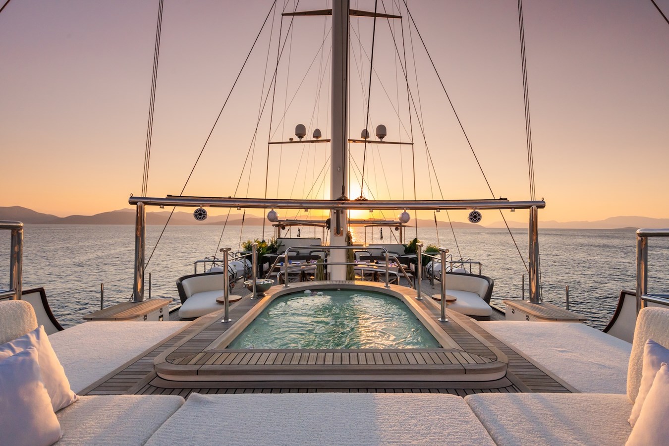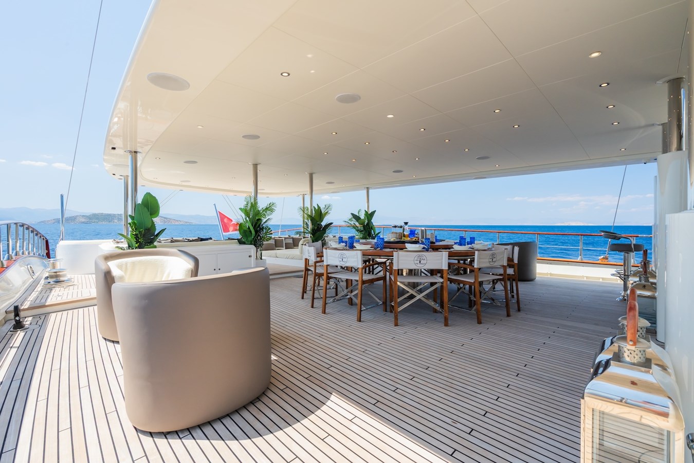 The sundeck features a central Jacuzzi, oversized sunpads, and multiple lounge and dining areas, alongside a fully equipped bar and grill. Alfresco dining is available on both the main and upper decks, each with elegant aft seating areas.