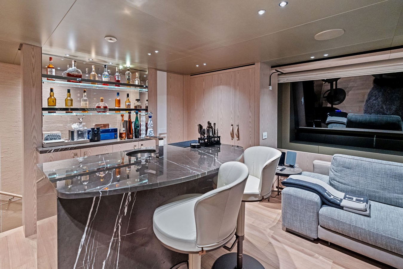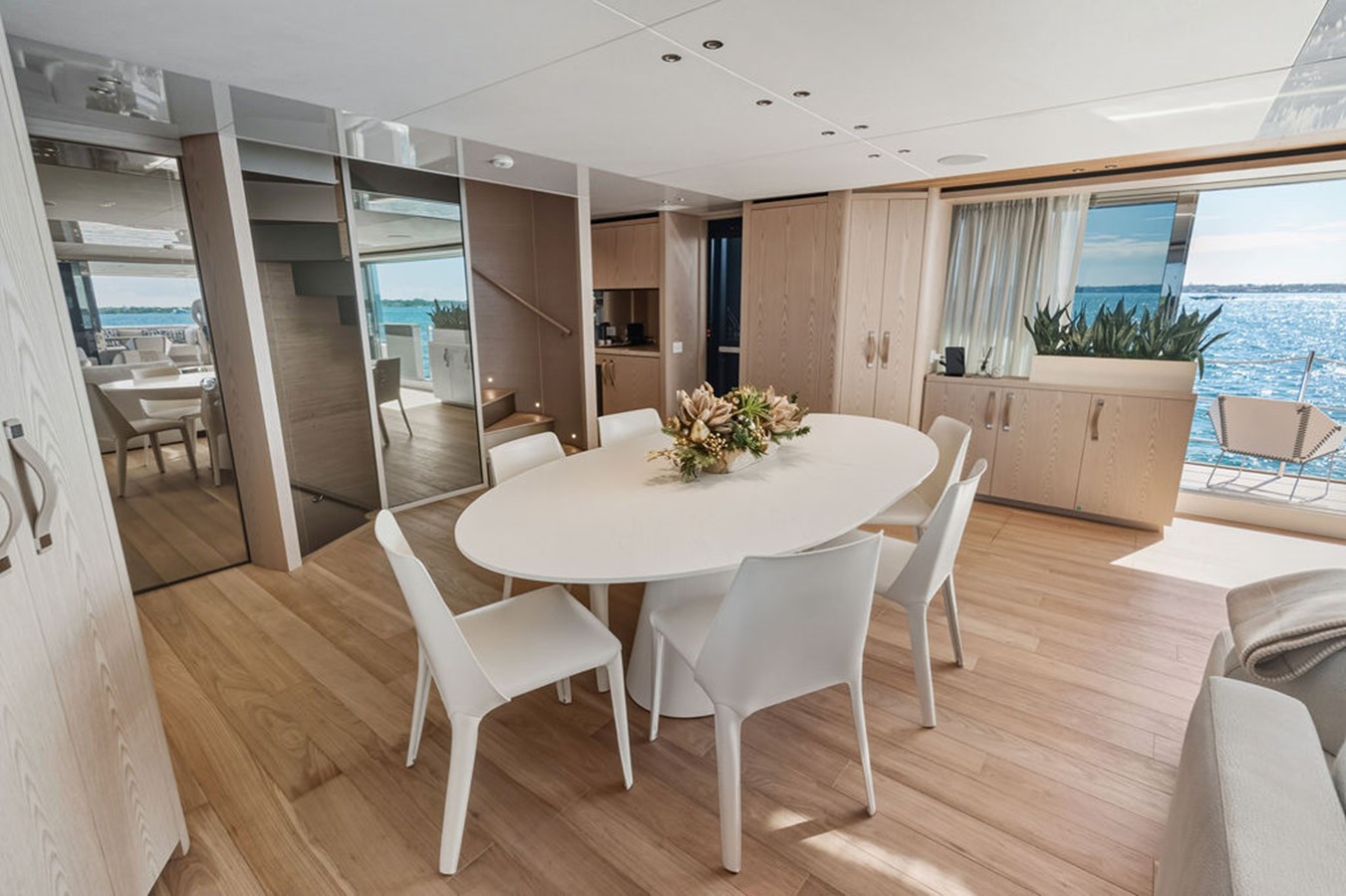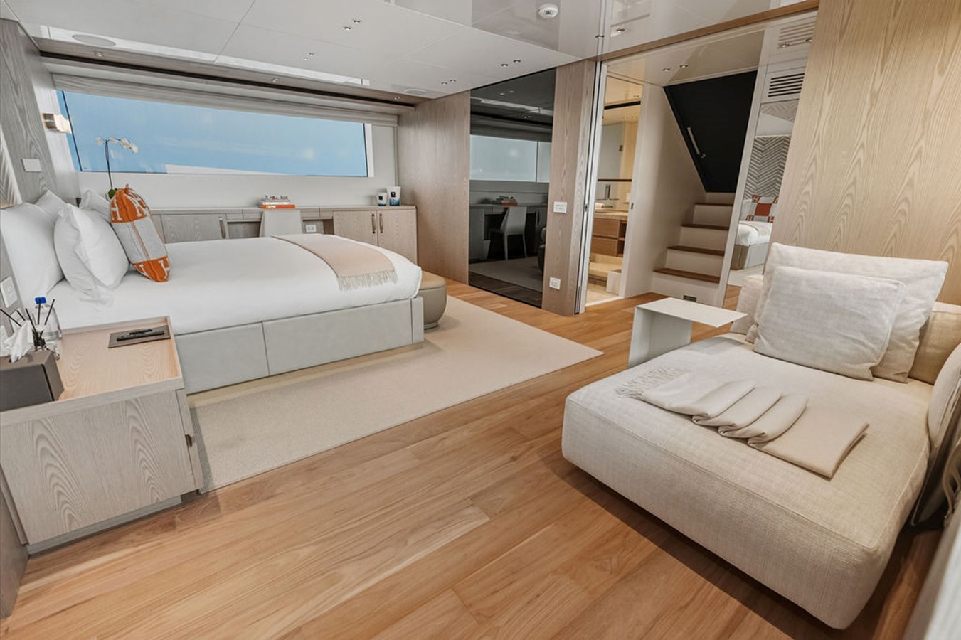 Step inside and you are welcomed by a custom interior by Marty Lowe, thoughtfully curated to feel both contemporary and timeless. Natural textures, bespoke furnishings, and a calming, sophisticated palette create a warm residential atmosphere, one that feels instantly inviting and entirely unique. This is a yacht designed to be lived on, not just admired.
