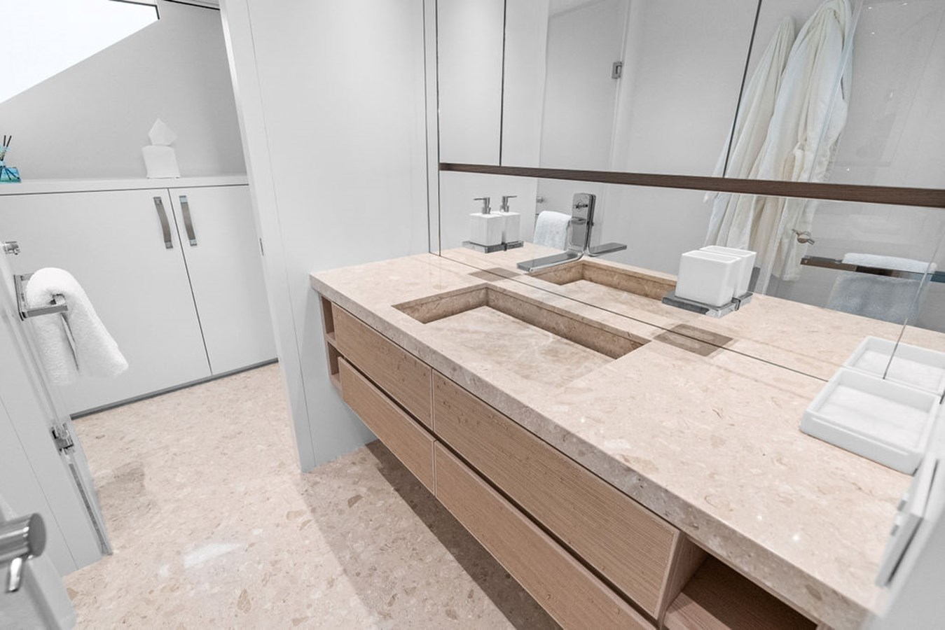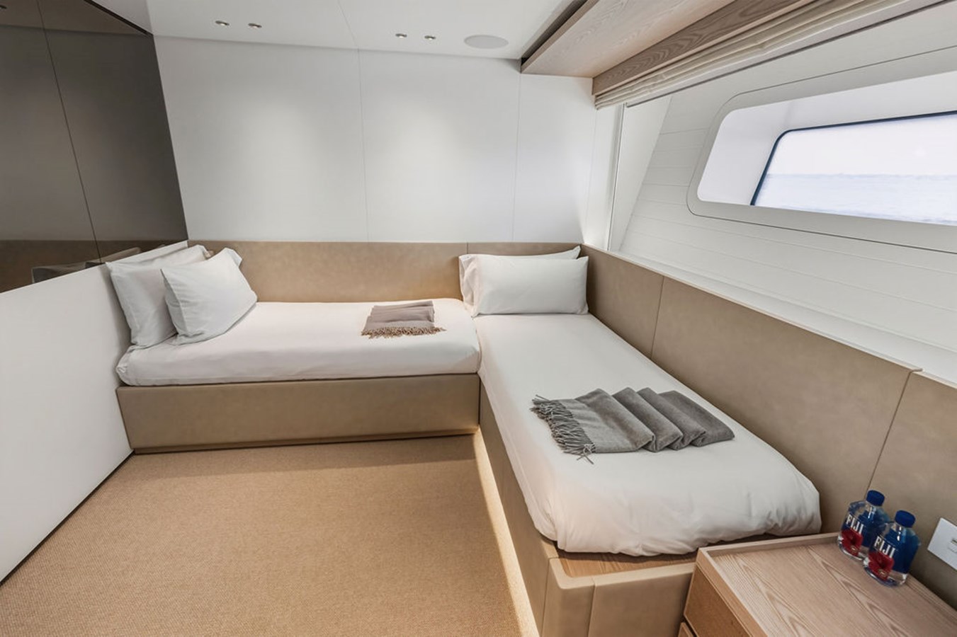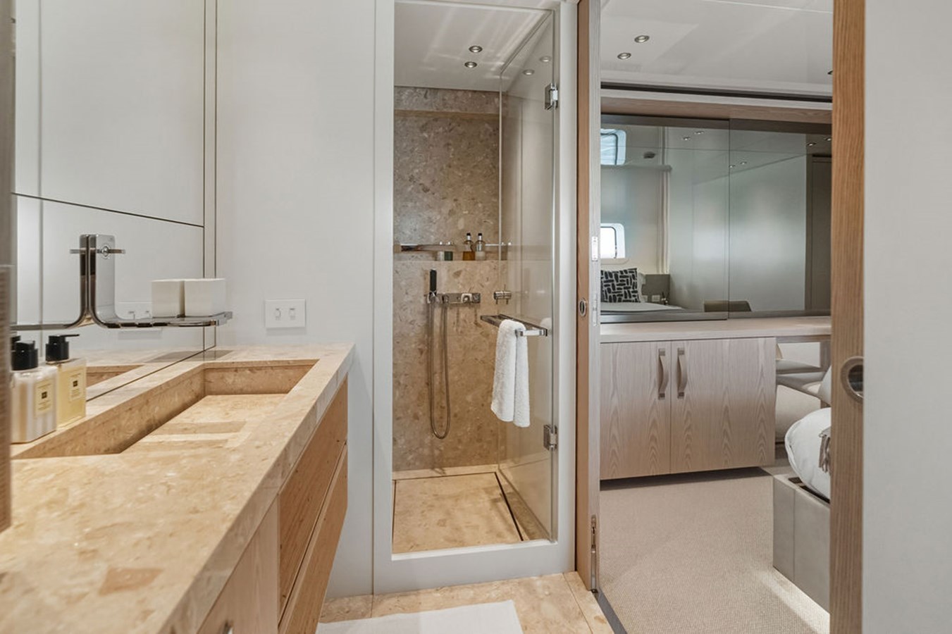 Step inside and you are welcomed by a custom interior by Marty Lowe, thoughtfully curated to feel both contemporary and timeless. Natural textures, bespoke furnishings, and a calming, sophisticated palette create a warm residential atmosphere, one that feels instantly inviting and entirely unique. This is a yacht designed to be lived on, not just admired.