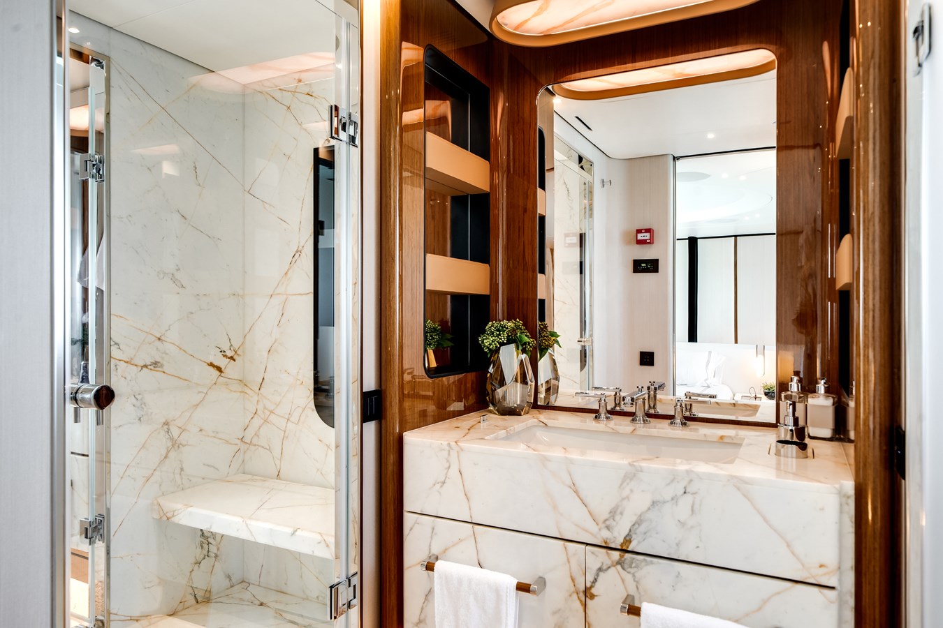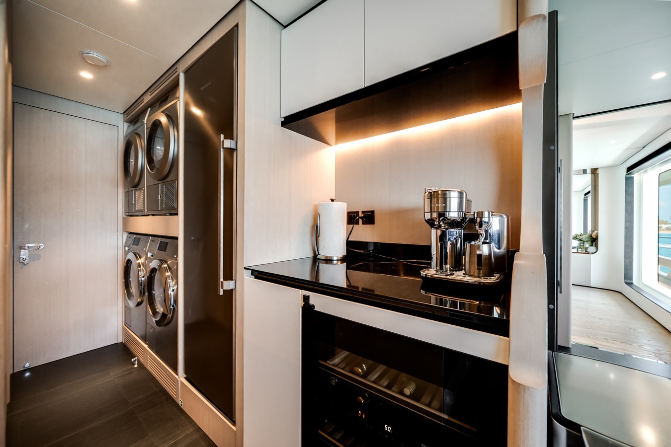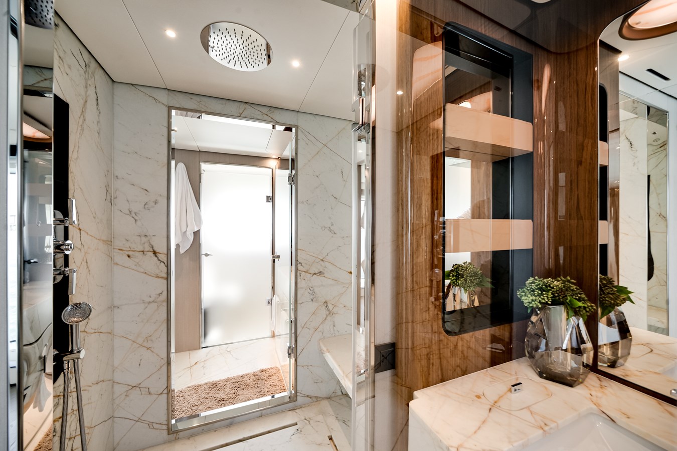 Her interiors, curated under Salvagni’s original essence selection, feature extensive marble detailing, custom furnishings from renowned European brands, and tailored fabrics throughout. Flexible guest accommodations, professional-grade laundry upgrades, expanded refrigeration and wine storage, and a Platinum navigation and A/V package with Smart Boat integration ensure effortless luxury living onboard.