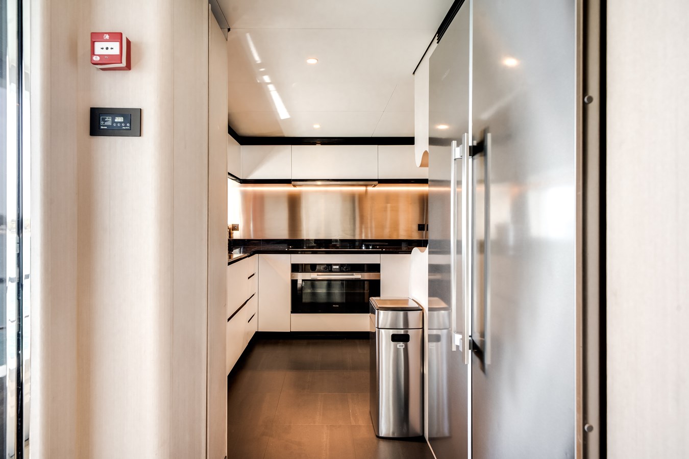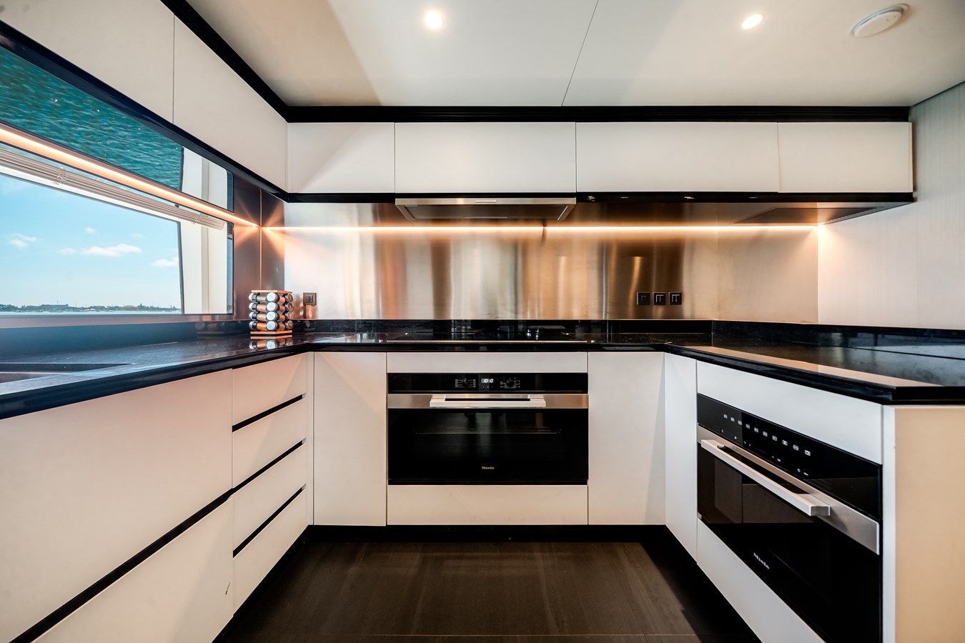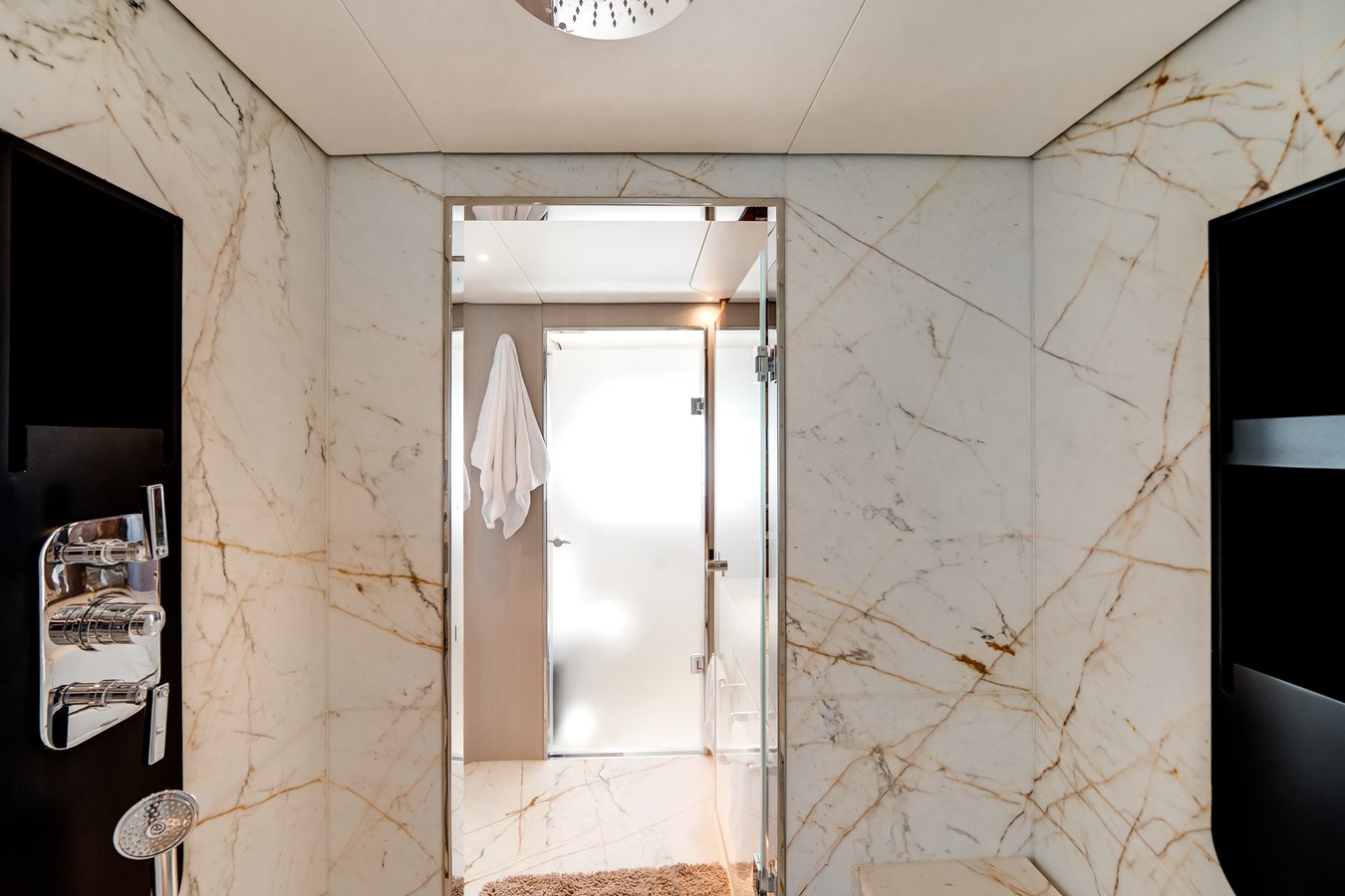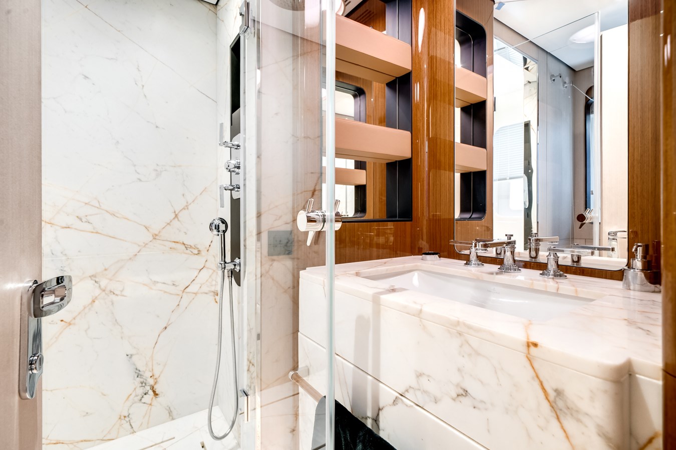 Her interiors, curated under Salvagni’s original essence selection, feature extensive marble detailing, custom furnishings from renowned European brands, and tailored fabrics throughout. Flexible guest accommodations, professional-grade laundry upgrades, expanded refrigeration and wine storage, and a Platinum navigation and A/V package with Smart Boat integration ensure effortless luxury living onboard.