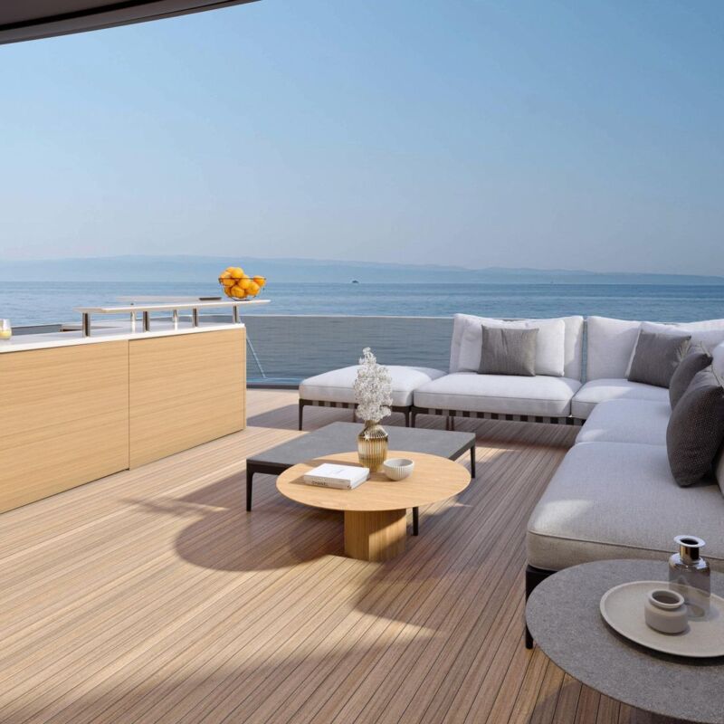 A standout feature of the yacht is the extendable beach club at the aft. Equipped with folding hydraulic panels, the SX100 expands its beam, creating a spacious platform for relaxation, socializing, or easy access to water activities. The open design lets guests enjoy uninterrupted views, enhancing the yacht’s luxurious atmosphere.