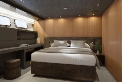 The yacht features a layout with three double cabins and one twin cabin, complete with a Pullman bed for extra guest accommodation. Each cabin boasts elegant interiors, comfortable furnishings, and en-suite bathrooms, ensuring a high level of comfort and privacy. The spacious main deck highlights Sanlorenzo’s innovative design, blending minimalist style with functional luxury. The seamless transition between indoor and outdoor areas creates a welcoming atmosphere, while the flybridge and aft deck provide ample space for dining, lounging, or sunbathing. The design emphasizes a smooth flow between indoor and outdoor spaces for ultimate relaxation.