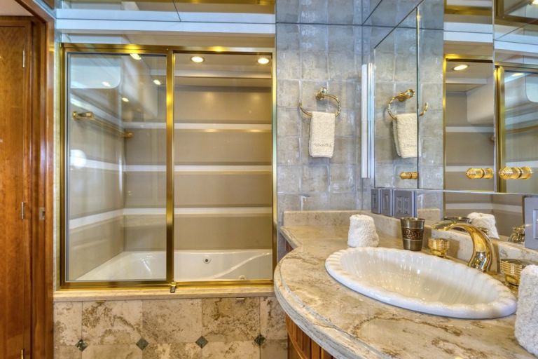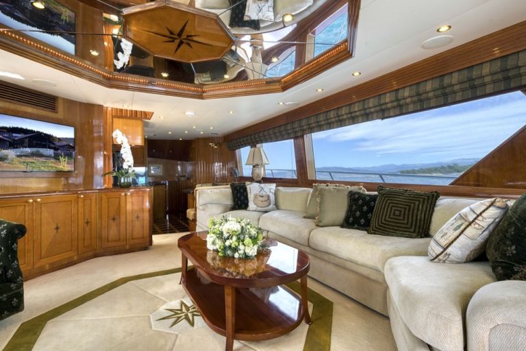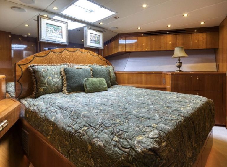 Her highly customized high-gloss cherry interior features a four-cabin layout to include the Captain, her VIPs, and two twin cabins. Two separate crew cabins are located at the private aft with cockpit access.