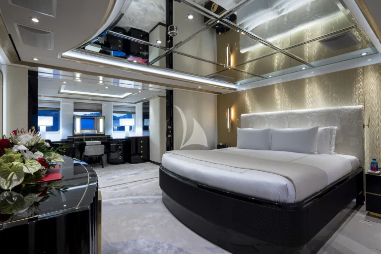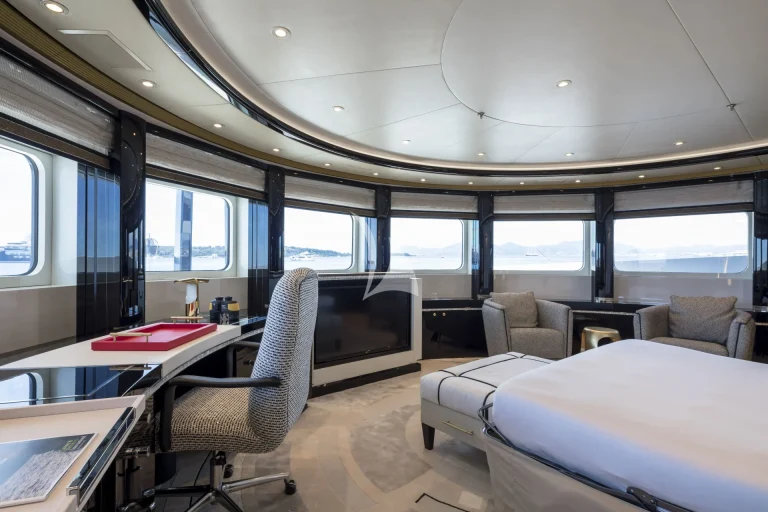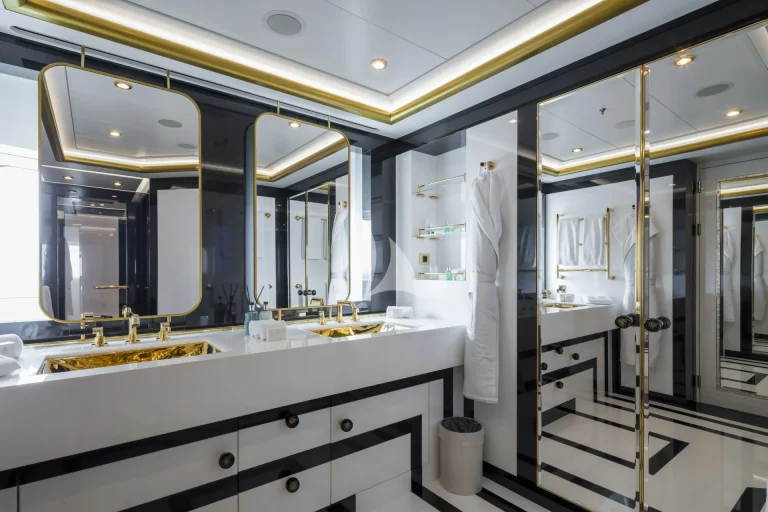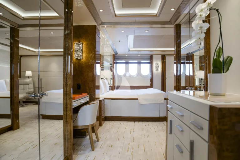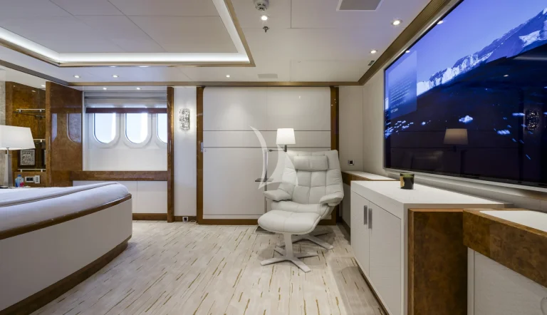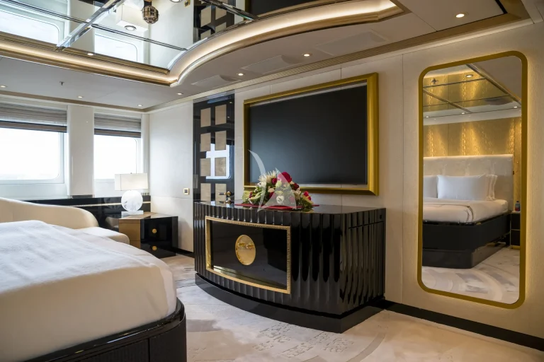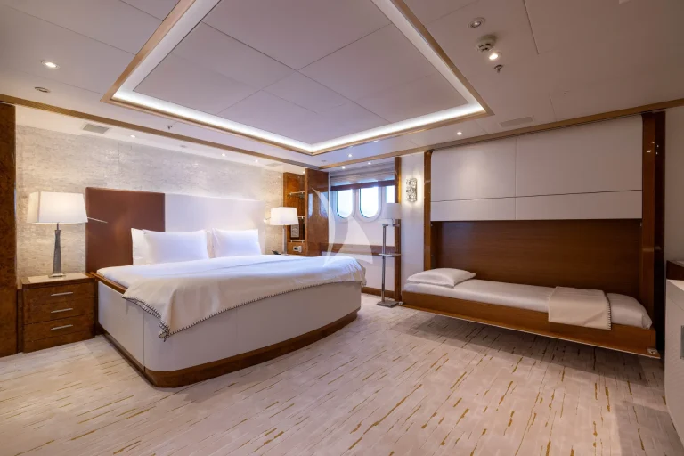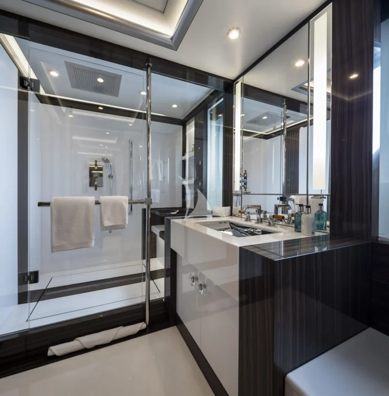 Owner’s Suite: Located on the main deck, this suite includes expansive His & Hers walk-in wardrobes and en-suite bathrooms. Her bathroom has double wash basins, large windows, a private toilet and bidet, steam shower, heated towel rail, and underfloor heating. His bathroom features a Japanese toilet, heated towel rail, and underfloor heating. The suite also leads to an observation lounge/office with 180-degree panoramic views and private access to the forward deck, which includes a fold-out queen-size bed and TV.