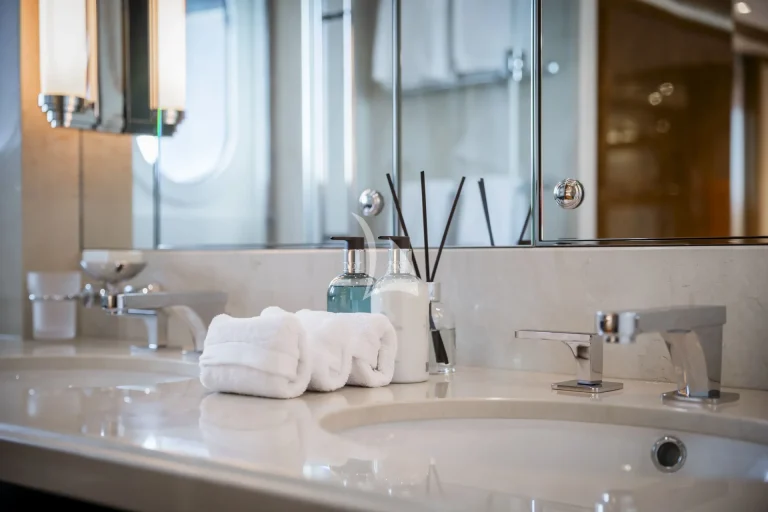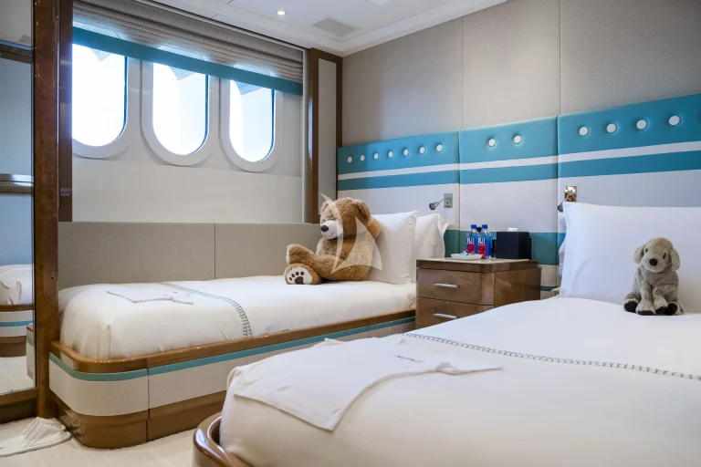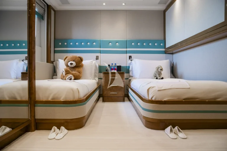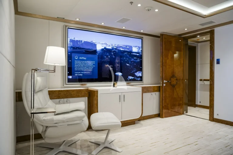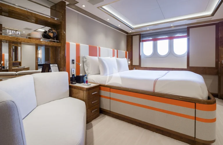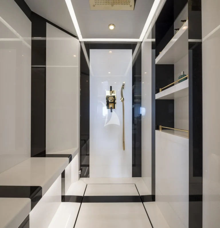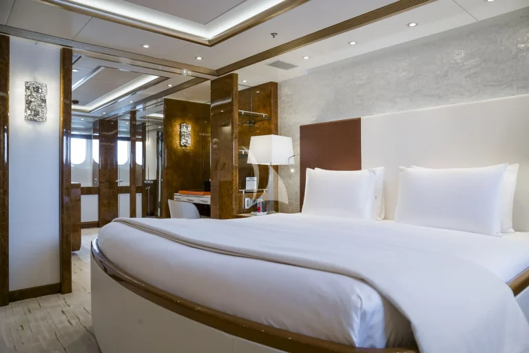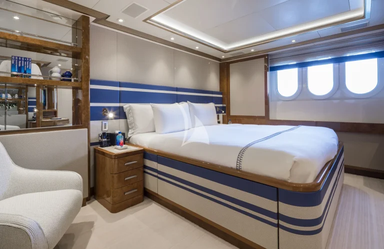 Owner’s Suite: Located on the main deck, this suite includes expansive His & Hers walk-in wardrobes and en-suite bathrooms. Her bathroom has double wash basins, large windows, a private toilet and bidet, steam shower, heated towel rail, and underfloor heating. His bathroom features a Japanese toilet, heated towel rail, and underfloor heating. The suite also leads to an observation lounge/office with 180-degree panoramic views and private access to the forward deck, which includes a fold-out queen-size bed and TV.