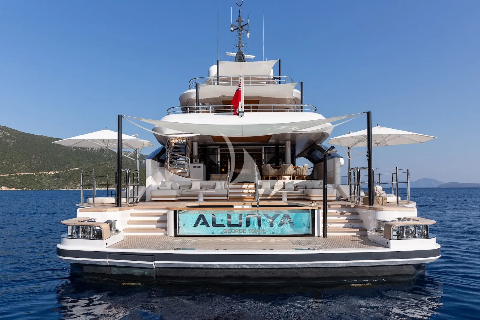 Marking Benetti’s sixth hull in its multi-award-winning B.Now 50m series, ALUNYA was launched in 2023 at the shipyard’s Livorno facilities. The renowned British design studio RWD provided the concept design and exterior styling, while the Italian studio PierLuigi Ausonio was responsible for the naval architecture. The yacht spans four decks in total, with a seamless indoor-outdoor layout, including a main saloon looking directly out onto the Oasis Deck, a revolutionary nautical design concept offering a convivial, sea-immersive onboard lifestyle with a 36 sqm beach club. The open-out wings extend the width of the deck, creating closer contact with the water, whilst providing protection from the waves. The stunning infinity pool is integrated into the heart of the socialising area, so that it is flush with the deck, giving a feeling of being close to the sea.