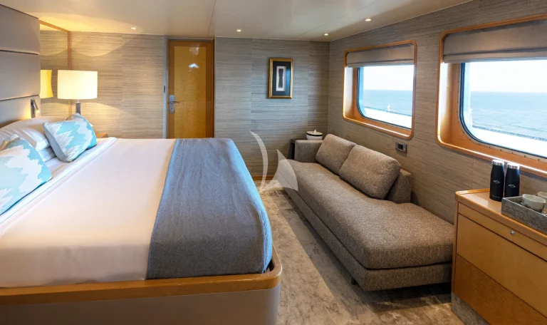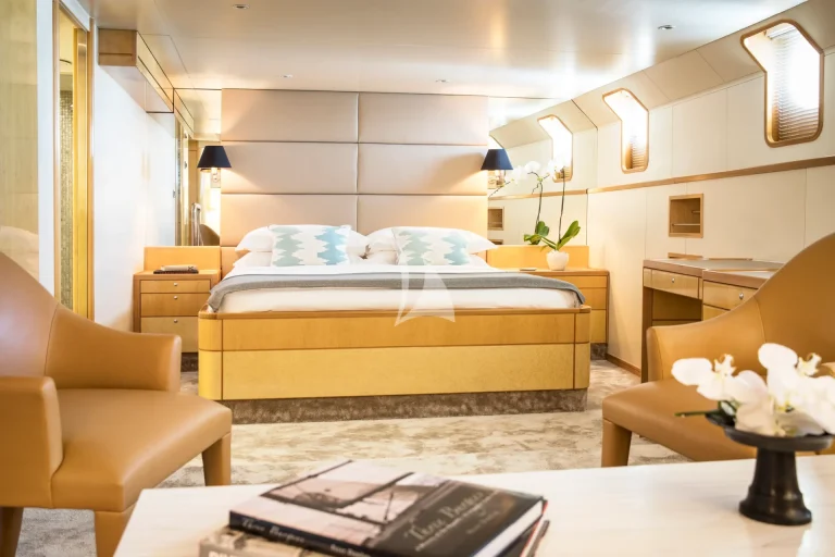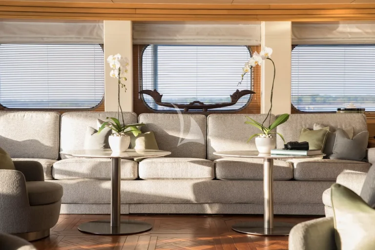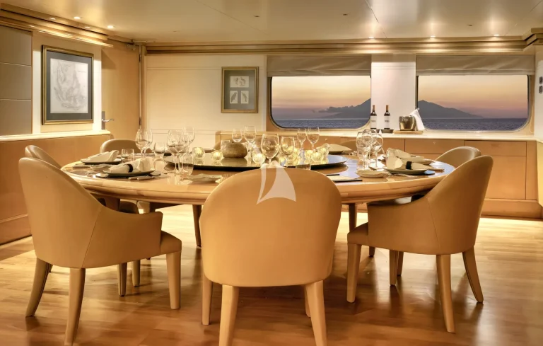 The sun deck offers 360-degree views with wraparound lounge sofas, a full bar, barbecue, and shaded seating — the perfect setting for sunrise yoga, sunset drinks, or dinner beneath the stars. For those looking to keep active, an open-air fitness area and Jacuzzi surrounded by daybeds offer both movement and relaxation. Al fresco dining is a highlight, with a generous outdoor table where Chef Benjamin serves up dishes inspired by the region. And when it’s time for a quieter moment, there’s always a peaceful corner to retreat to.