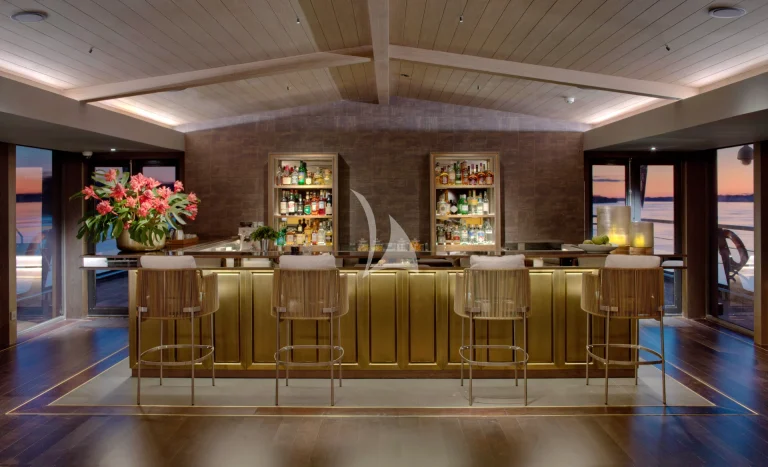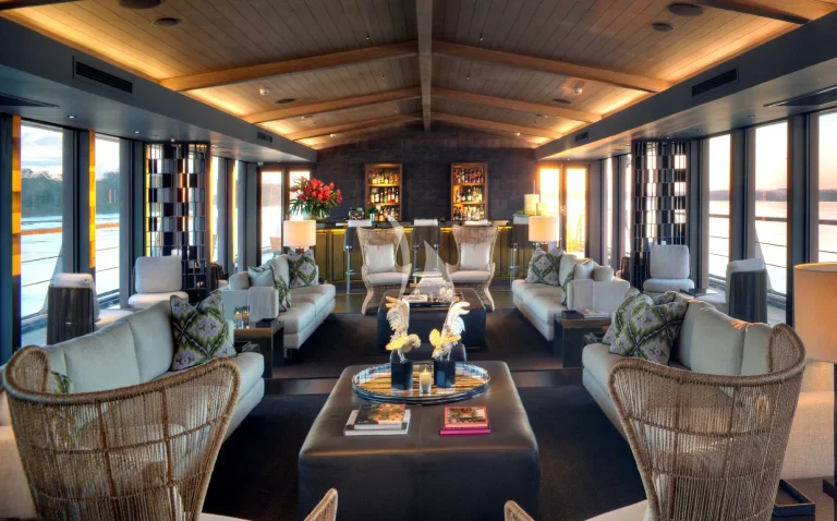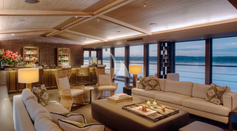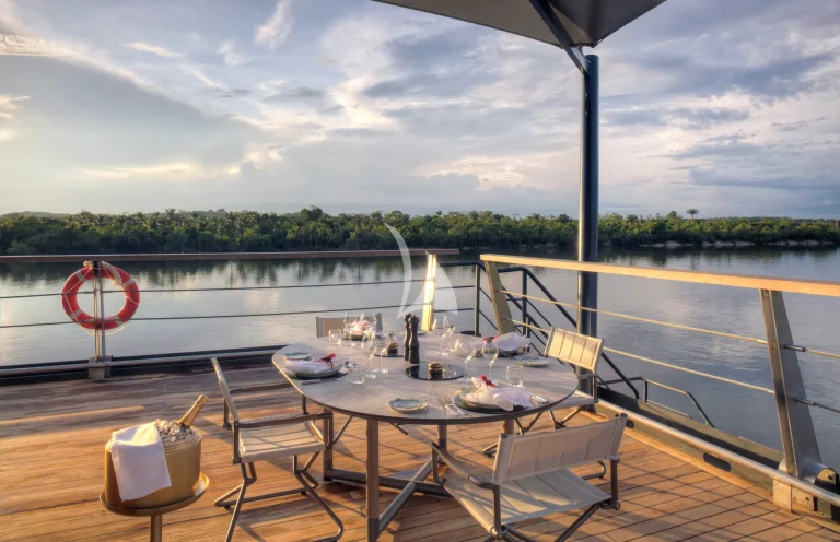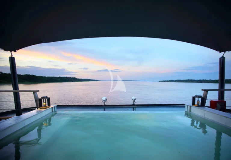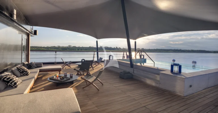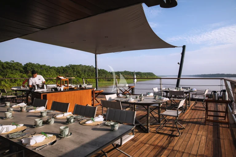 At the front of the ship, a plunge pool with canopy cover offers a cool escape after jungle hikes or skiff rides. In the evenings, the open-air bar becomes a natural gathering point for sunset views, stargazing, or film screenings under the stars.