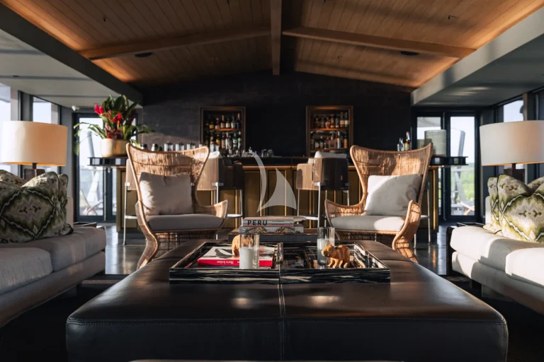 Aqua Nera’s interiors blend clean, modern lines with dark wood tones and soft lighting, drawing from the black-water lagoons and lush forests of the Amazon. Wellness and comfort go hand in hand on board. There’s a fully equipped gym with floor-to-ceiling windows, and a peaceful spa with private treatment rooms. On the second deck, guests gather in a dining room that reflects Chef Pedro’s culinary approach: refined and full of local flavour. Other highlights include a large lounge and bar, library, and cinema room.