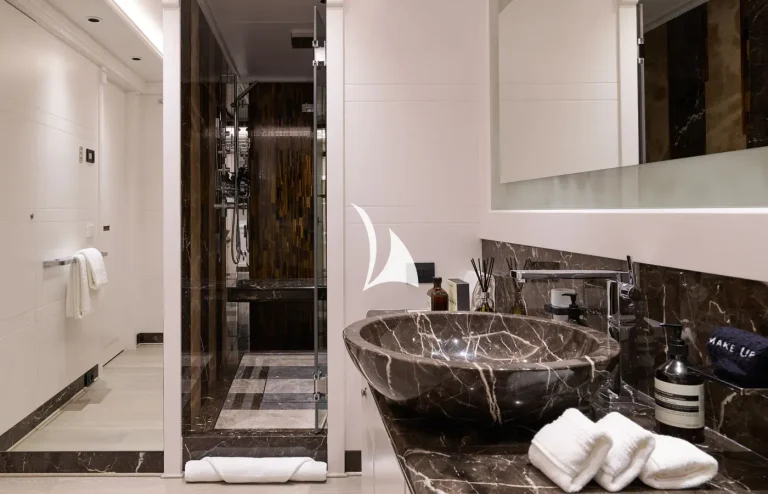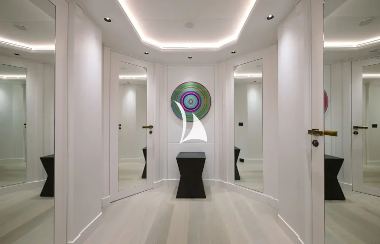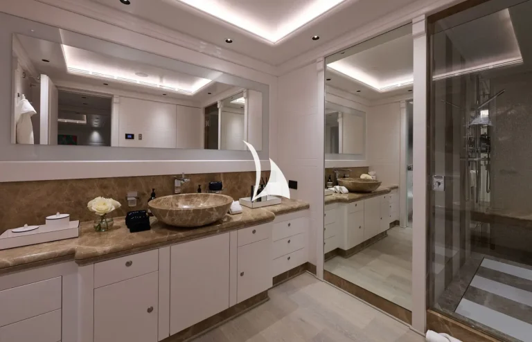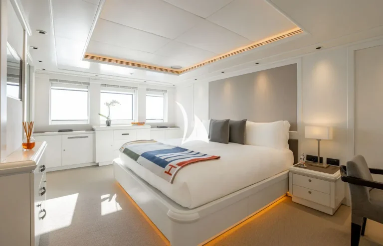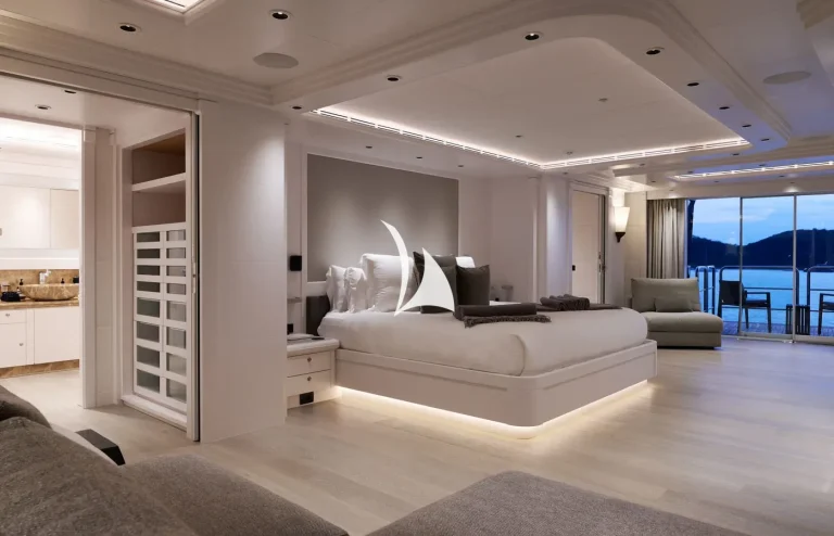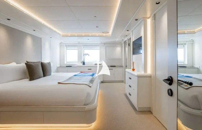 The yacht can accommodate twelve guests and two supernumeraries across eight fully refurbished cabins. On the main deck lies a full-beam master cabin with fold-down balcony, private TV room and massage room. There is also a VIP cabin on the upper deck and two double cabins on the main deck. The rest of the guest accommodation is situated on the lower deck and comprises two double cabins and two twin cabins.
