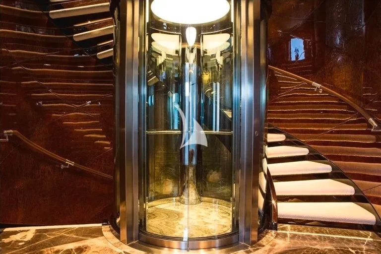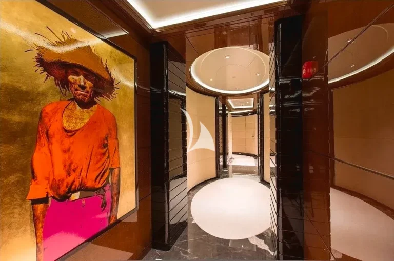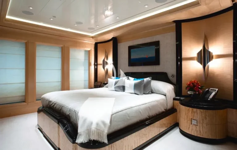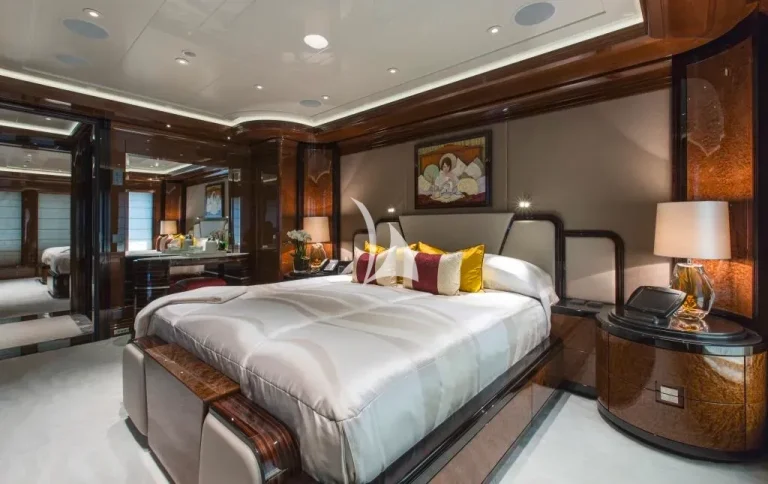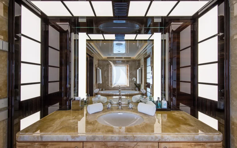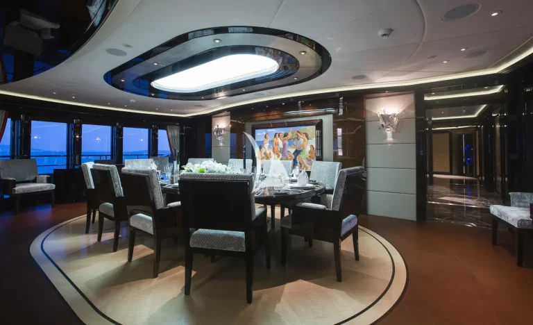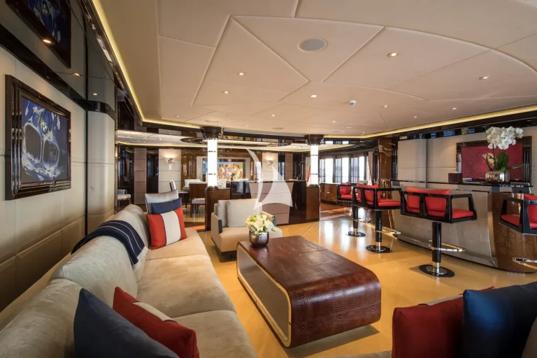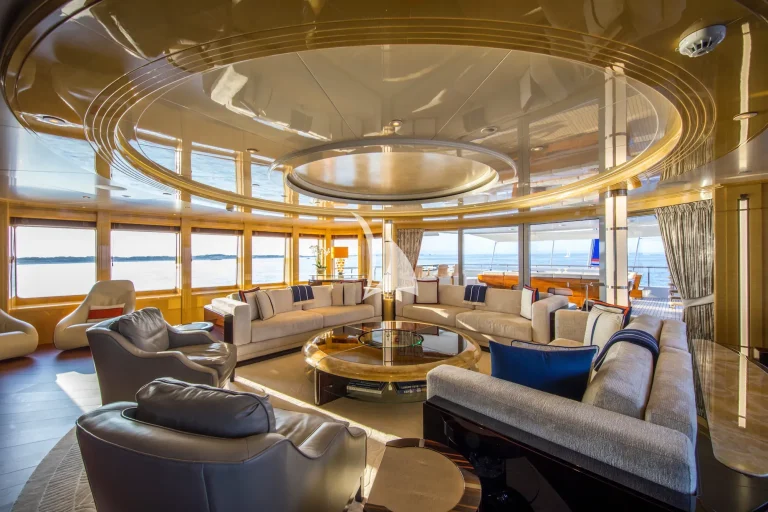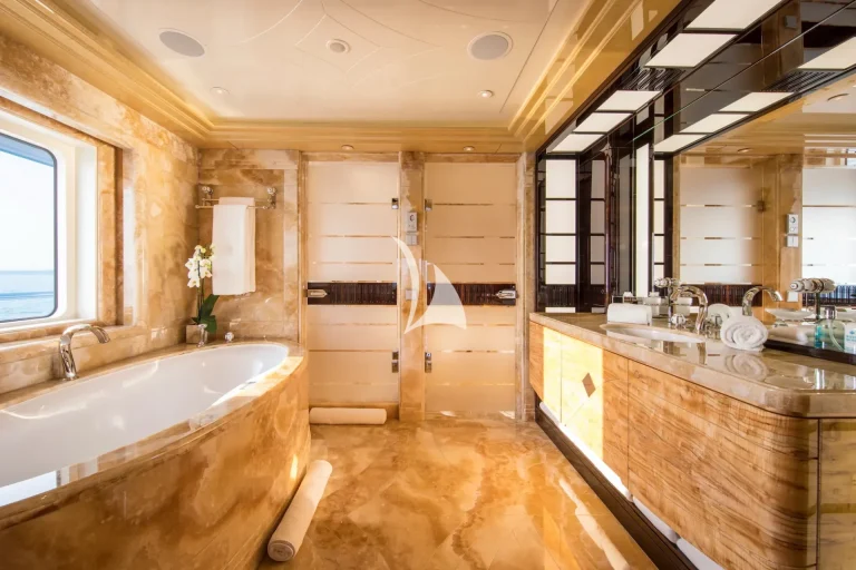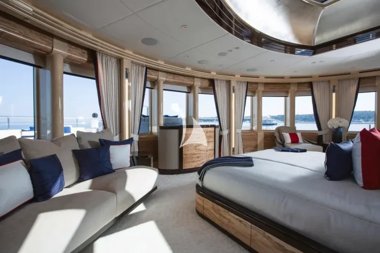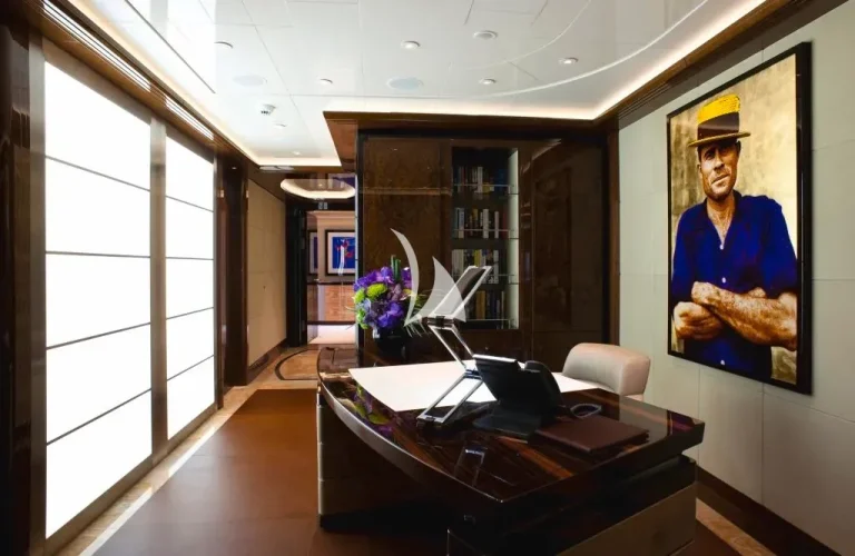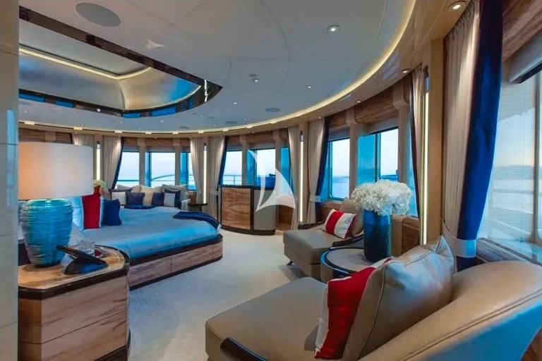 Accommodating guests in 7 cabins – 3 double and 2 twin cabins on the main deck, with the Master Suite and the 7th cabin on the owner’s deck above, she is able to carry 12 guests and 2 staff. On the lower deck, there is a full cinema with reclining chairs, an open waterside gym and separate bar / spa lounging. On the main deck, in addition to the guests cabins, there is a welcoming bar and lounge area, interior dining room and welcoming half-moon exterior seating. On the Owner’s deck, travelling forward through the private office with the 7th cabin to the port side is the Master suite with a 180-degree view and large private deck with seating and jacuzzi, his and her bathrooms (with bath and shower). To the aft of the Owner’s deck, is a large and welcoming lounge with card table and opens onto the exterior deck where there is a bar and sofas. The bridge deck is all about the exterior with a large buffet for serving, dining table for 12 with wrap-around windbreaks to protect from the elements and cosy seating. On the sundeck is the spa pool with waterfall and forward seating area. All decks are connected by the central circular lift.