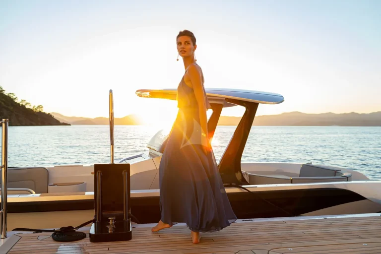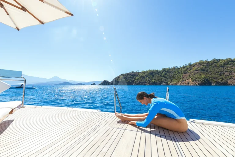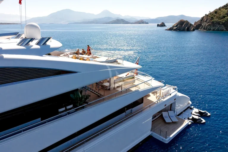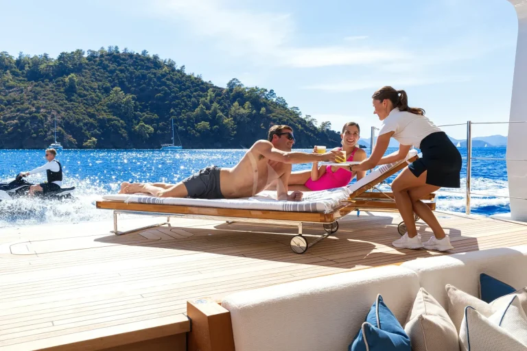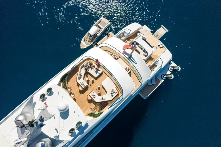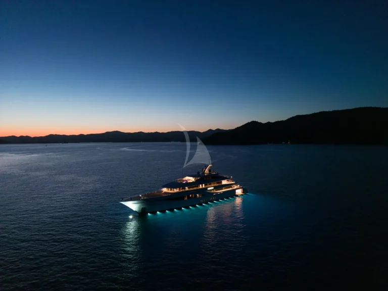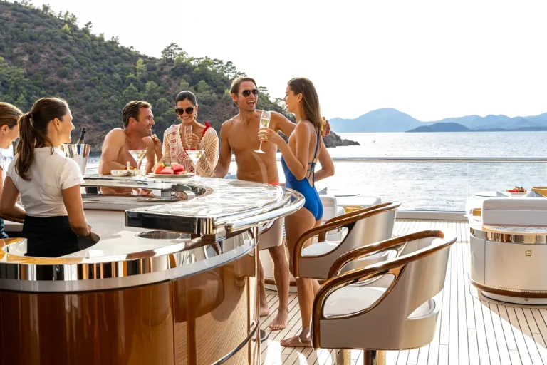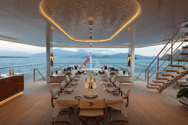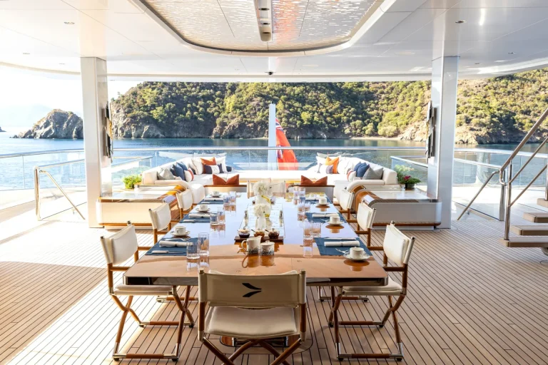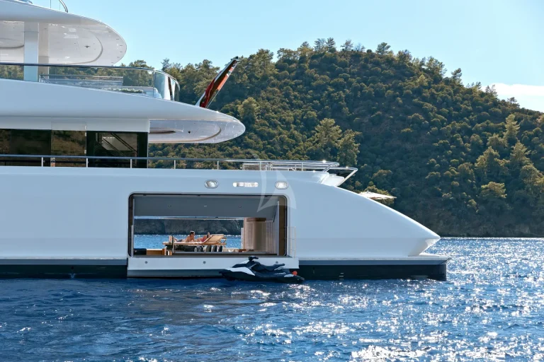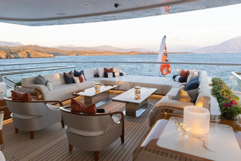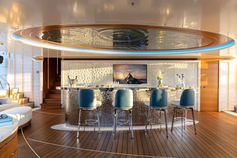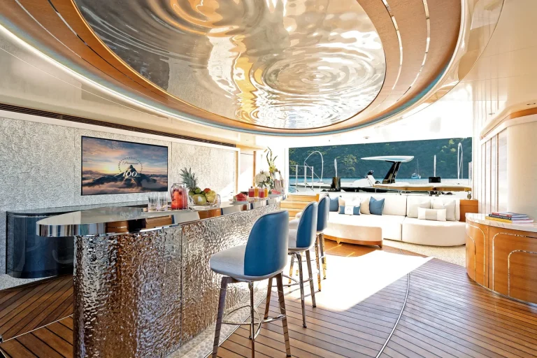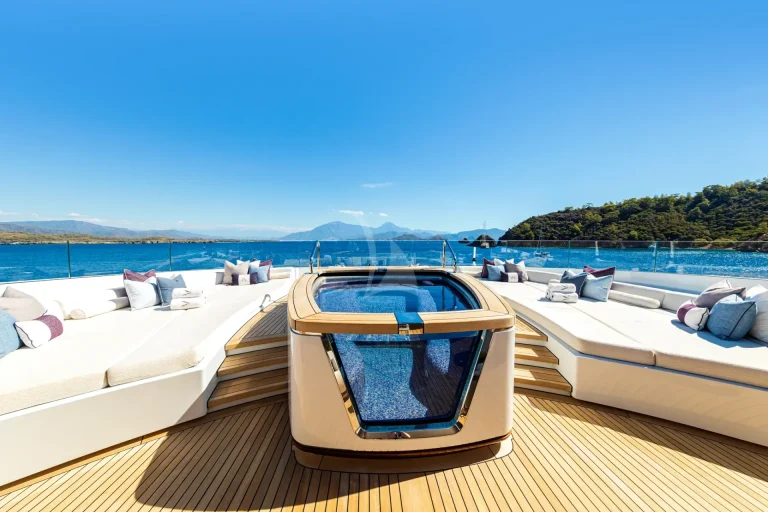 Charter guests will love her exquisite sun deck, with its partially transparent Jacuzzi with sunpads forward, pizza oven and barbecue area, gym – which can be either open or enclosed – a cool sit-up bar and lots of lounging options, including C-shaped sofas aft with more infinity views.