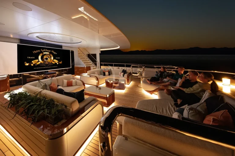 Formal dining for 12 round a glass table lies beyond and further still there’s a cinema area with surround sound. Up in the bridge deck sky lounge, doors open up to the aft terrace seamlessly, where guests can enjoy alfresco dining under the protection of retractable glass panels or chill out in the lounge area aft and enjoy enviable vistas through the infinity view glass bulwarks.