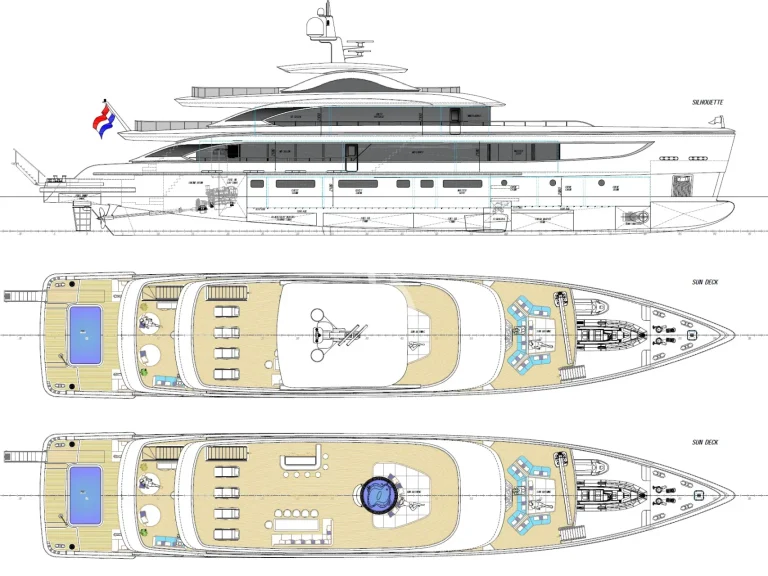 The sundeck is designed for ultimate relaxation and entertainment, offering a spacious layout with a variety of luxurious amenities. A dedicated sunbathing area is equipped with comfortable sunbeds, ideal for soaking up the sun throughout the day.