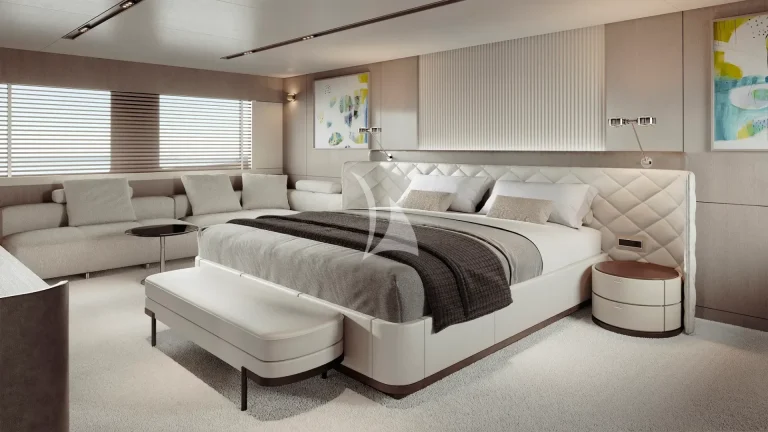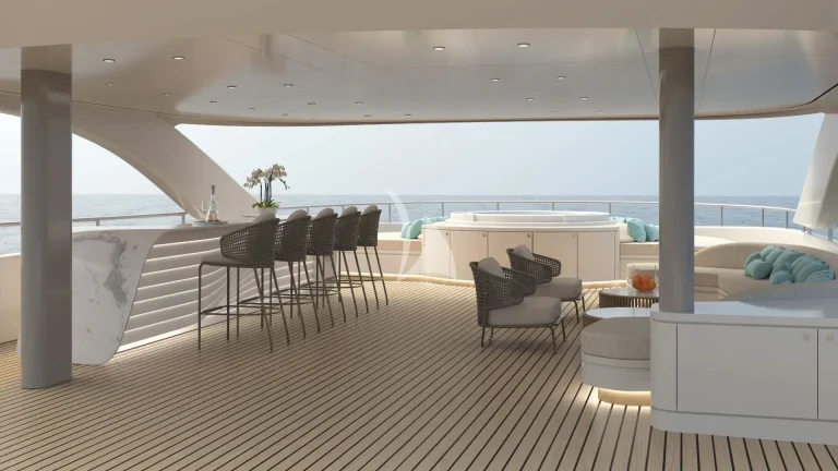 The swim platform and beach club area offer effortless access to the water. This spacious zone features a comfortable lounge area and sun loungers, providing the perfect setting for unwinding at the water’s edge. A standout feature is the Wave Pool/Jacuzzi, measuring 4.20m x 2.20m, ideal for refreshing dips or soaking in comfort while enjoying proximity to the sea. Just a few steps, takes guests up to the main deck.